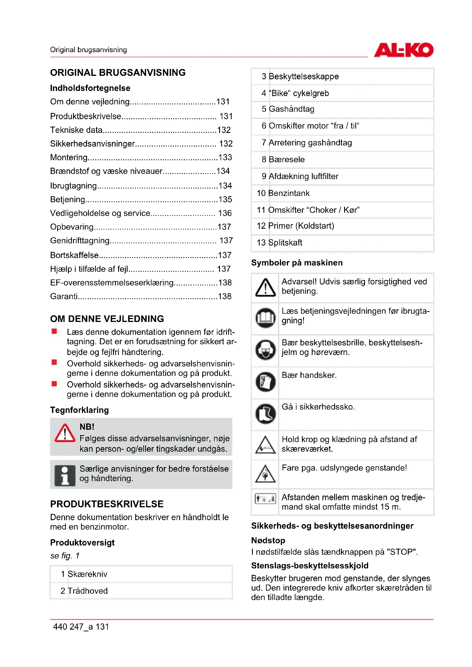 - Produkt Producent Befuldmægtiget repræsentant Motordrevne Type BC 4535 II AL-KO Geräte GmbH Ichenhauser Str. 14 D-89359 Kötz Anton Eberle Ichenhauser Str. 14 D-89359 Kötz Seriennummer EU-direktiver Harmoniserede standarder G 230 2305 Kötz, 01.06.2012 2006/42/EG 2004/108/EG 2000/14/EG (13) 2002/88/EG ISO 11806:2009-01 ISO 14982:1998-09 Antonio De Filippo Managing Director Lydeffektniveau målt: 109 dB(A) garanteret: 113 dB(A) Overensstemmelsesvurdering 2000 /14/EG bilag V GARANTI Eventuelle materiale- eller fabrikationsfejl på apparatet afhjælper vi under den lovpligtige forældelsesfrist for mangelkrav efter vores skøn gennem reparation eller erstatningslevering. Forældelsesfristen bestem- mes af lovgivningen i det land, hvor apparatet blev købt. Vores garanti gælder kun ved: overholdelse af denne driftsvejledning sagkyndig håndtering anvendelse af originale reservedele Garantien bortfalder ved: egenmægtige reparationsforsøg egenmægtige tekniske ændringer ikke-formålsbestemt anvendelse Garantien dækker ikke: lakskader, som stammer fra normal slitage sliddele, som på reservedelskortet står i parentes [xxx xxx (x)] forbrændningsmotorer (her gælder den pågældende motorproducents garantibestemmelser) Garantiperioden begynder ved købet gennem den første slutkunde. Afgørende er datoen på kvitteringen. Henvend dig med denne erklæring og den originale kvittering til din forhandler eller til den nærmeste kundeservice. Køberens lovpligtige garantikrav overfor sælgeren forbliver uberørt af denne erklæring.Orginalbruksanvisning 440 247_a 139 ORGINALBRUKSANVISNING Innehållsförteckning Om denna handbok p. 139