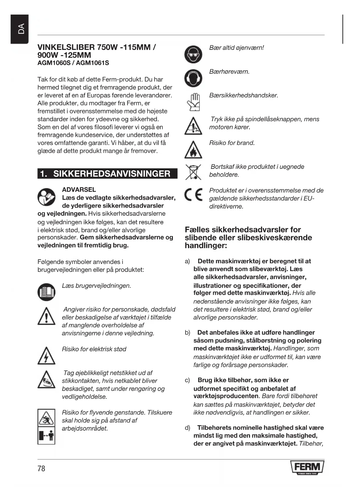 ADVARSEL Læs de vedlagte sikkerhedsadvarsler, de yderligere sikkerhedsadvarsler og vejledningen. Hvis sikkerhedsadvarslerne og vejledningen ikke følges, kan det resultere i elektrisk stød, brand og/eller alvorlige personskader. Gem sikkerhedsadvarslerne og vejledningen til fremtidig brug. Følgende symboler anvendes i brugervejledningen eller på produktet: Læs brugervejledningen. Angiver risiko for personskade, dødsfald eller beskadigelse af værktøjet i tilfælde af manglende overholdelse af anvisningerne i denne vejledning. Risiko for elektrisk stød Tag øjeblikkeligt netstikket ud af stikkontakten, hvis netkablet bliver beskadiget, samt under rengøring og vedligeholdelse. Risiko for flyvende genstande. Tilskuere skal holde sig på afstand af arbejdsområdet. Bær altid øjenværn! Bær høreværn. Bær sikkerhedshandsker. Tryk ikke på spindellåseknappen, mens motoren kører. Risiko for brand. Bortskaf ikke produktet i uegnede beholdere. Produktet er i overensstemmelse med de gældende sikkerhedsstandarder i EU- direktiverne. Fælles sikkerhedsadvarsler for slibende eller slibeskiveskærende handlinger: a) Dette maskinværktøj er beregnet til at blive anvendt som slibeværktøj. Læs alle sikkerhedsadvarsler, anvisninger, illustrationer og specikationer, der følger med dette maskinværktøj. Hvis alle nedenstående anvisninger ikke følges, kan det resultere i elektrisk stød, brand og/eller alvorlige personskader. b) Det anbefales ikke at udføre handlinger såsom pudsning, stålbørstning og polering med dette maskinværktøj. Handlinger, som maskinværktøjet ikke er udformet til, kan være farlige og forårsage personskader. c) Brug ikke tilbehør, som ikke er udformet specikt og anbefalet af værktøjsproducenten. Bare fordi tilbehøret kan sættes på maskinværktøjet, betyder det ikke nødvendigvis, at handlingen er sikker. d) Tilbehørets nominelle hastighed skal være mindst lig med den maksimale hastighed, der er angivet på maskinværktøjet. Tilbehør,79