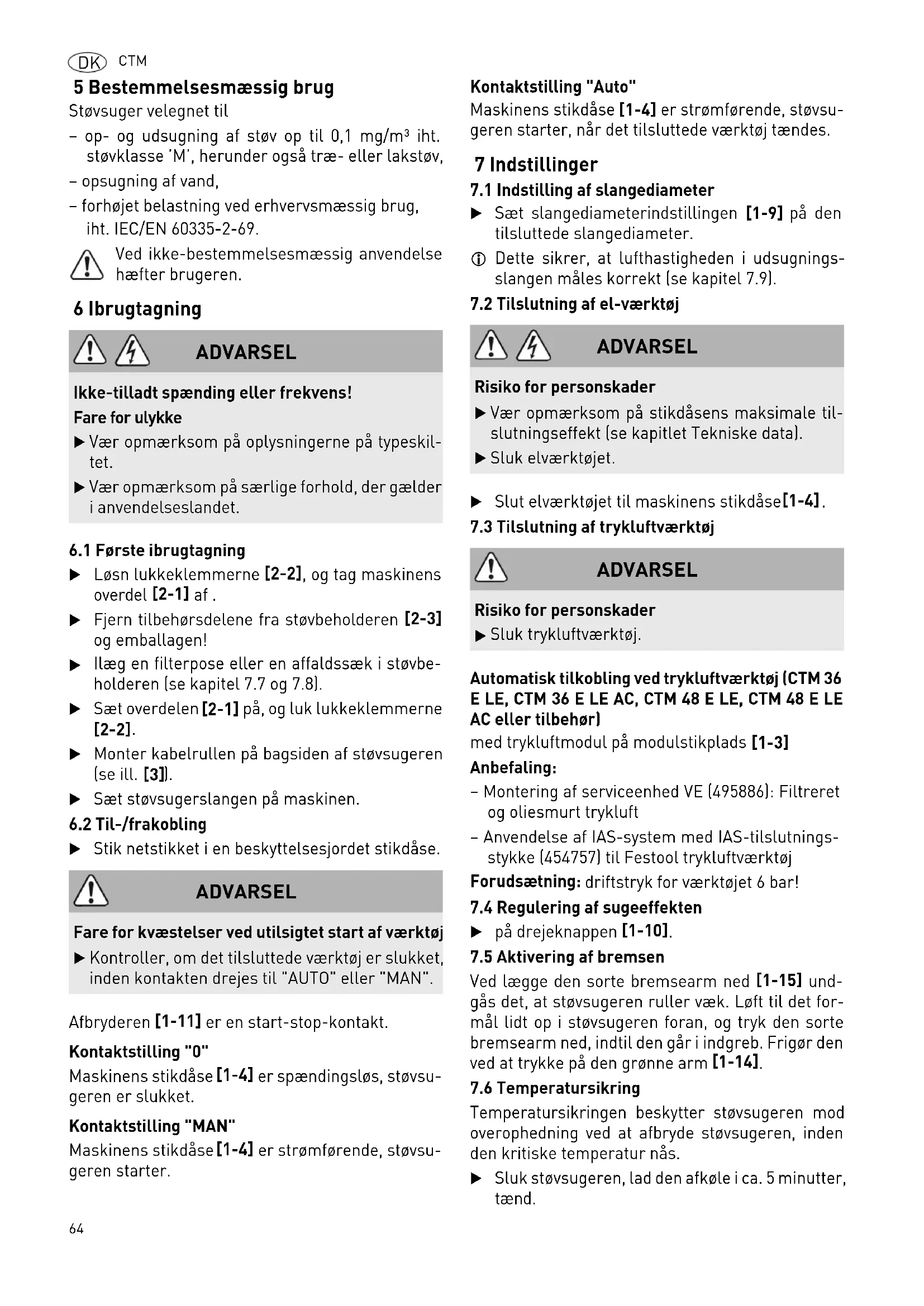 5 Bestemmelsesmæssig brug Støvsuger velegnet til – op- og udsugning af støv op til 0,1 mg/m³ iht. støvklasse ’M’, herunder også træ- eller lakstøv, – opsugning af vand, – forhøjet belastning ved erhvervsmæssig brug, iht. IEC/EN 60335-2-69. Ved ikke-bestemmelsesmæssig anvendelse hæfter brugeren. 6 Ibrugtagning
