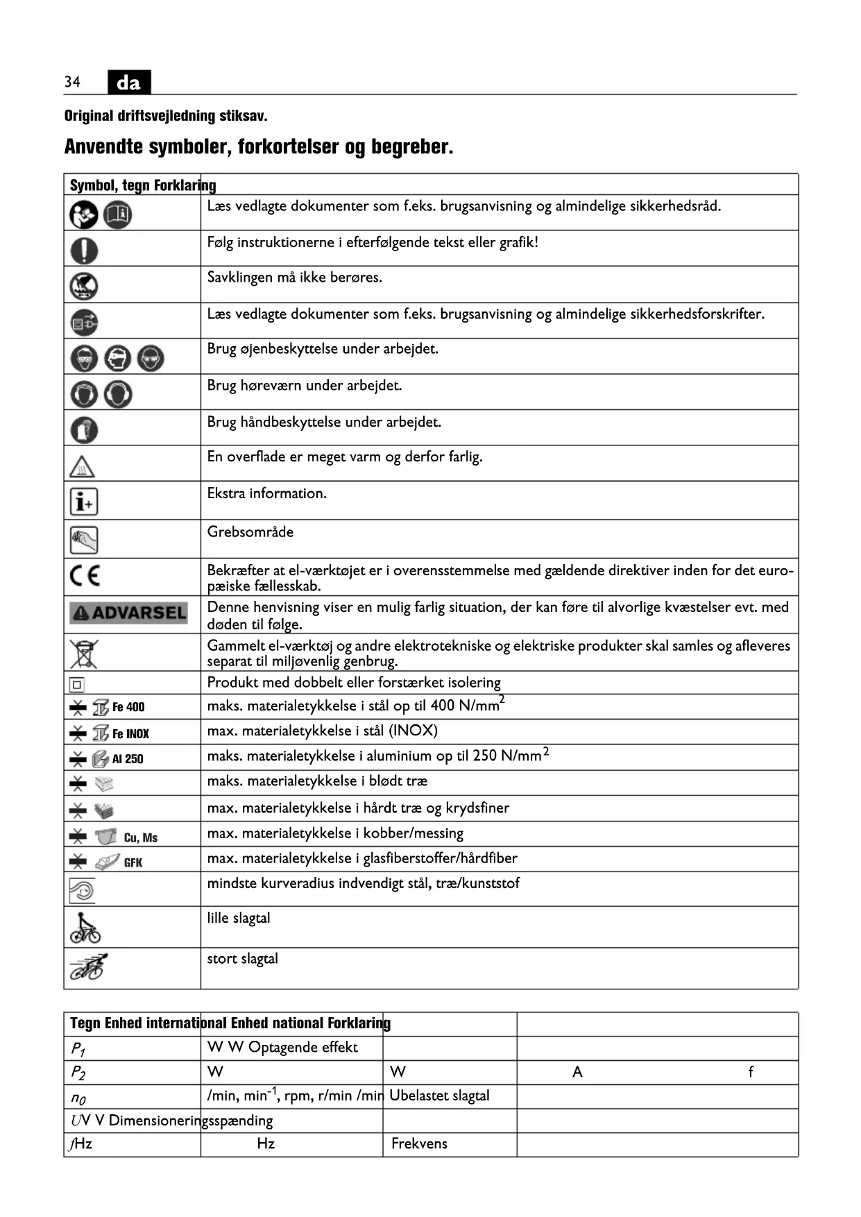 | Fe 400 | Gammelt el-værtøj og andre elektrotekniske og elektriskeprodukter skal samles og afleveres separat til miljøvenlig genbrug. |