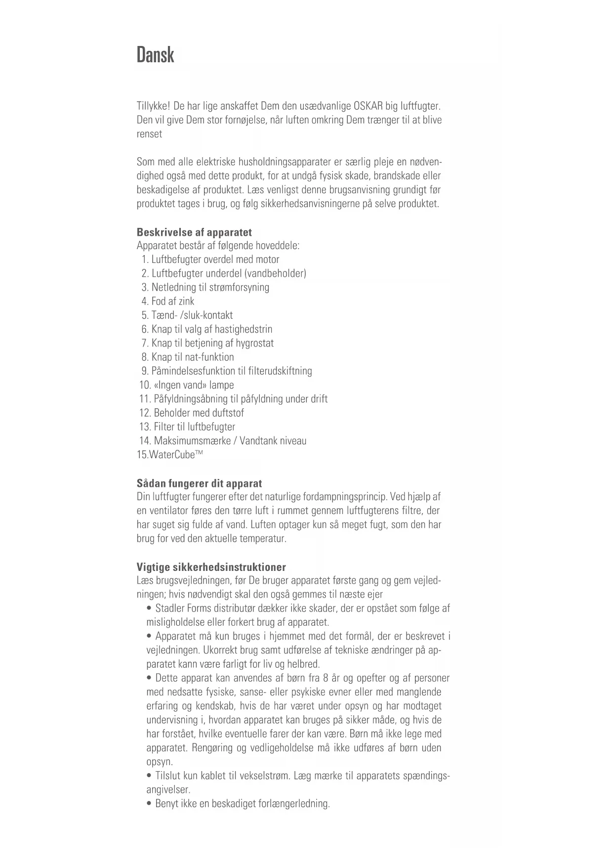 Sådan fungerer dit apparat Din luftfugter fungerer efter det naturlige fordampningsprincip. Ved hjælp af en ventilator føres den tørre luft i rummet gennem luftfugterens filtre, der har suget sig fulde af vand. Luften optager kun så meget fugt, som den har brug for ved den aktuelle temperatur. Vigtige sikkerhedsinstruktioner Læs brugsvejledningen, før De bruger apparatet første gang og gem vejled- ningen; hvis nødvendigt skal den også gemmes til næste ejer