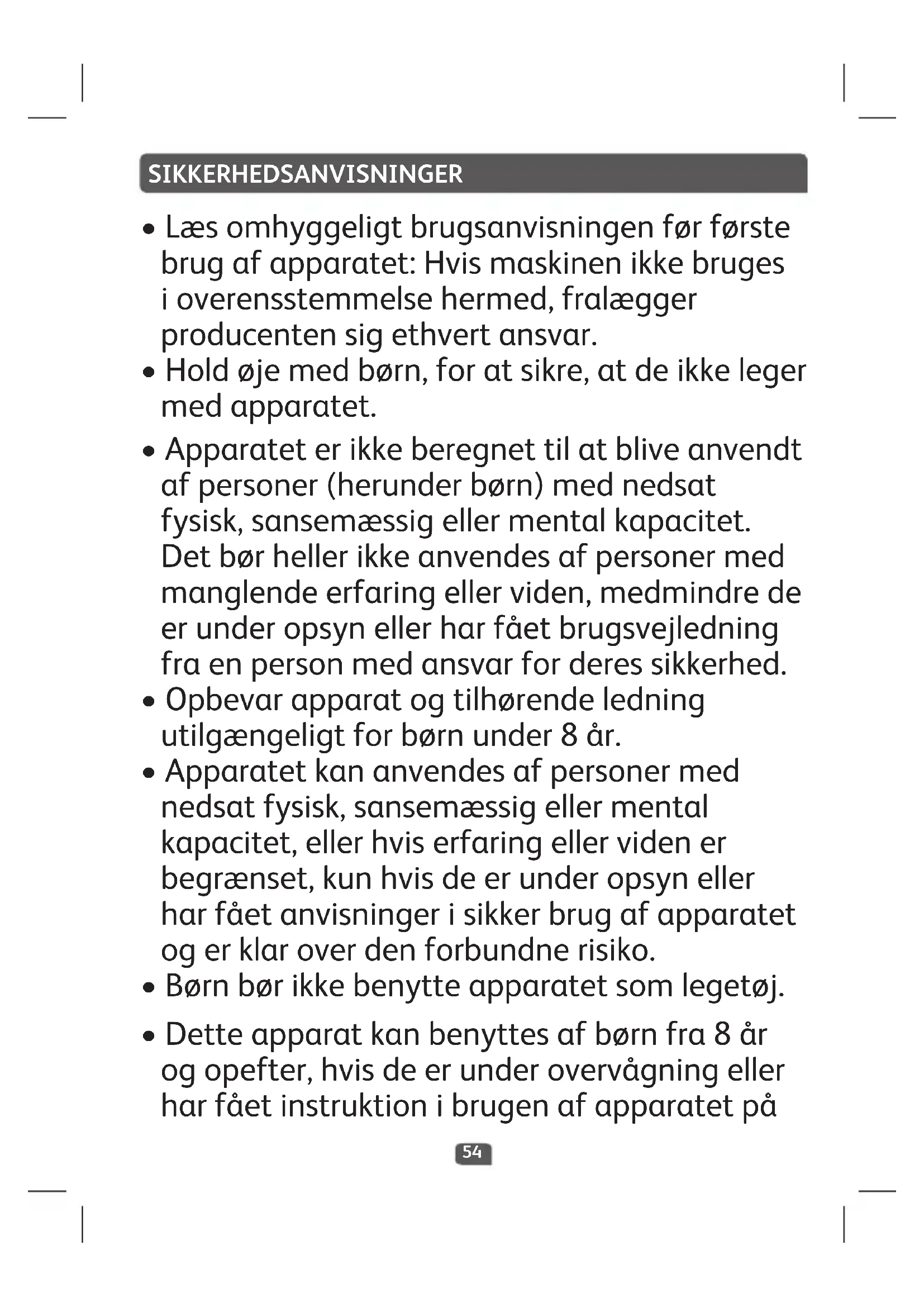 - Apparateterikkeberegnettilatbliveanvendt afpersoner(herunderbørn)mednedsat fysisk,sansemæssigellermentalkapacitet. Detbørhellerikkeanvendesafpersonermed manglendeerfaringellerviden,medmindrede erunderopsynellerharfåetbrugsvejledning fraenpersonmedansvarforderessikkerhed.