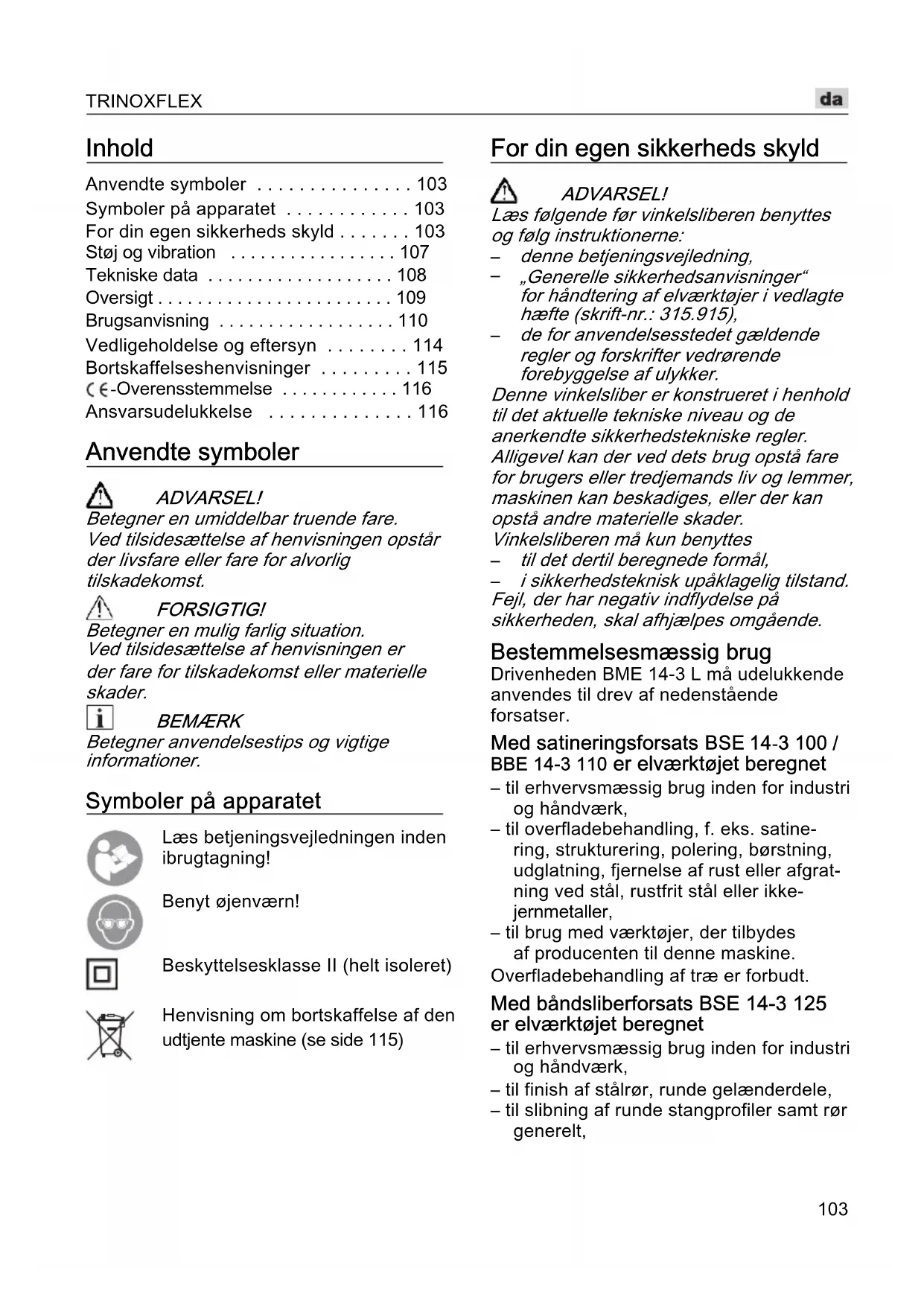 - Ansvarsudelukkelse Anvendte symboler ADVARSEL! Betegner en umiddelbar truende fare. Ved tilsidesættelse af henvisningen opstår der livsfare eller fare for alvorlig tilskadekomst. FORSIGTIG! Betegner en mulig farlig situation. Ved tilsidesættelse af henvisningen er der fare for tilskadekomst eller materielle skader. BEMÆRK Betegner anvendelsestips og vigtige informationer. Symboler på apparatet Læs betjeningsvejledningen inden ibrugtagning!Benyt øjenværn!Beskyttelsesklasse II (helt isoleret)Henvisning om bortskaffelse af den udtjente maskine (se side 115) For din egen sikkerheds skyld ADVARSEL! Læs følgende før vinkelsliberen benyttes og følg instruktionerne: p. 116