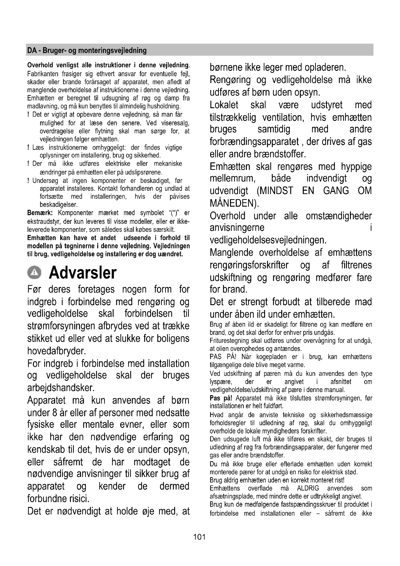 Vedlikehold Rengjøring Til rengjøring skal det KUN benyttes en klut fuktet med et nøytralt rengjøringsmiddel. VERKTØY ELLER APPARATER SKAL IKKE BRUKES TIL RENGJØRING! Unngå bruk av slipende eller etsende produkter. ALKOHOL SKAL IKKE BRUKES! Fettfilteret Fig. 28-29-30 Fanger kokefettpartikler. Det skal rengjøres minst en gang i måneden (eller når systemet som angir filtermetning - dersom dette finnes på modellen man er i besittelse av - angir at dette er nødvendig), med vaskemidler som ikke er aggressive, i oppvaskmaskin på lav temperatur og med en kort vaskesyklus. (Tmaks: 70°C) Ved vasking i oppvaskmaskin kan metalldeler misfarges. Filteret skal tørkes i ovnen med en temperatur på maksimalt 100°C i en time; dersom filteret fortsatt er fuktig, gjenta operasjonen. Skift ut filteret minst hvert 2. år. Vær oppmerksom! Etter å ha utført vedlikehold av filteret, installere fettfilteret FØRST i anordnet beholder, og DERETTER kullfilteret. Sistnevnte er gjenkjennelig ettersom den er forseglet i en strømpe. Når beholderen er satt på plass, sjekk at kun fettfilteret er synlig. Kullfilter (kun med resirkulering av luften) Fig. 28-29-30 Holder tilbake ubehagelige lukter fra matlaging. Vær oppmerksom! Aktivt kullfilter er gjenkjennelig ettersom den er forseglet i en strømpe. Utføre demonteringsoperasjoner, vedlikehold og rengjøring av filteret ved å håndtere filteret med ytterste forsiktighet, slik at man ikke skader eller åpner strømpen. Karbonfilteret kan vaskes annenhver måned (eller når det elektroniske systemet viser at filteret er skittent – hvis din modell har denne funksjonen) i varmt vann og med egnede rengjøringsmidler, eller i oppvaskmaskin ved 65°C (hvis man vasker det i oppvaskmaskin må det vaskes med full syklus uten annen oppvask i maskinen). Vri ut overflødig vann uten å ødelegge filteret, og sett det deretter i stekeovnen ved 100°C i 10 minutter for å tørke det ordentlig. Skift ut “madrassen” hvert 3. år og ellers hver gang stoffet er skadet. Vær oppmerksom! Etter å ha utført vedlikehold av filteret, installere fettfilteret FØRST i anordnet beholder, og DERETTER kullfilteret. Sistnevnte er gjenkjennelig ettersom den er forseglet i en strømpe. Når beholderen er satt på plass, sjekk at kun fettfilteret er synlig. Utskifting av lyspærer Fig. 29 Ventilatoren er utstyrt med et belysningssystem basert på LED-teknologi. LED-lysene garanterer optimal belysning, har opptil 10 ganger lengre varighet enn tradisjonelle lyspærer og tillater en strømsparing på 90 %. For kjøp av lysdioder som må skiftes ut, vennligst kontakt teknisk støtte.101 DA - Bruger- og monteringsvejledning Overhold venligst alle instruktioner i denne vejledning. Fabrikanten frasiger sig ethvert ansvar for eventuelle fejl, skader eller brande forårsaget af apparatet, men afledt af manglende overholdelse af instruktionerne i denne vejledning. Emhætten er beregnet til udsugning af røg og damp fra madlavning, og må kun benyttes til almindelig husholdning. ! Det er vigtigt at opbevare denne vejledning, så man får mulighed for at læse den senere. Ved viseresalg, overdragelse eller flytning skal man sørge for, at vejledningen følger emhætten. ! Læs instruktionerne omhyggeligt: der findes vigtige oplysninger om installering, brug og sikkerhed. ! Der må ikke udføres elektriske eller mekaniske ændringer på emhætten eller på udslipsrørene. ! Undersøg at ingen komponenter er beskadiget, før apparatet installeres. Kontakt forhandleren og undlad at fortsætte med installeringen, hvis der påvises beskadigelser. Bemærk: Komponenter mærket med symbolet “(*)” er ekstraudstyr, der kun leveres til visse modeller, eller er ikke- leverede komponenter, som således skal købes særskilt. Emhætten kan have et andet udseende i forhold til modellen på tegninerne i denne vejledning. Vejledningen til brug, vedligeholdelse og installering er dog uændret. Advarsler Før deres foretages nogen form for indgreb i forbindelse med rengøring og vedligeholdelse skal forbindelsen til strømforsyningen afbrydes ved at trække stikket ud eller ved at slukke for boligens hovedafbryder. For indgreb i forbindelse med installation og vedligeholdelse skal der bruges arbejdshandsker. Apparatet må kun anvendes af børn under 8 år eller af personer med nedsatte fysiske eller mentale evner, eller som ikke har den nødvendige erfaring og kendskab til det, hvis de er under opsyn, eller såfremt de har modtaget de nødvendige anvisninger til sikker brug af apparatet og kender de dermed forbundne risici. Det er nødvendigt at holde øje med, at børnene ikke leger med opladeren. Rengøring og vedligeholdelse må ikke udføres af børn uden opsyn. Lokalet skal være udstyret med tilstrækkelig ventilation, hvis emhætten bruges samtidig med andre forbrændingsapparatet , der drives af gas eller andre brændstoffer. Emhætten skal rengøres med hyppige mellemrum, både indvendigt og udvendigt (MINDST EN GANG OM MÅNEDEN). Overhold under alle omstændigheder anvisningerne i vedligeholdelsesvejledningen. Manglende overholdelse af emhættens rengøringsforskrifter og af filtrenes udskiftning og rengøring medfører fare for brand. Det er strengt forbudt at tilberede mad under åben ild under emhætten. Brug af åben ild er skadeligt for filtrene og kan medføre en brand, og det skal derfor for enhver pris undgås. Friturestegning skal udføres under overvågning for at undgå, at olien overophedes og antændes. PAS PÅ! Når kogepladen er i brug, kan emhættens tilgængelige dele blive meget varme. Ved udskiftning af pæren må du kun anvendes den type lyspære, der er angivet i afsnittet om vedligeholdelse/udskiftning af pære i denne manual. Pas på! Apparatet må ikke tilsluttes strømforsyningen, før installationen er helt fuldført. Hvad angår de anviste tekniske og sikkerhedsmæssige forholdsregler til udledning af røg, skal du omhyggeligt overholde de lokale myndigheders fo