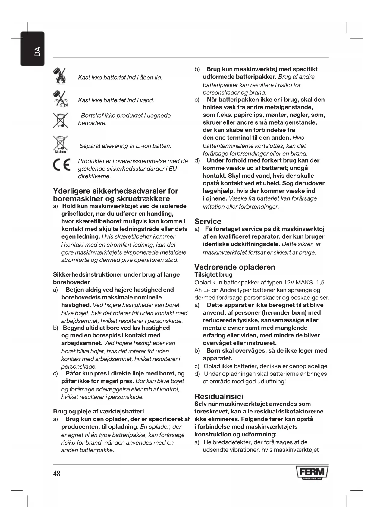 Kast ikke batteriet ind i åben ild. Kast ikke batteriet ind i vand. Bortskaf ikke produktet i uegnede beholdere. Separat aflevering af Li-ion batteri. Produktet er i overensstemmelse med de gældende sikkerhedsstandarder i EU- direktiverne. Yderligere sikkerhedsadvarsler for boremaskiner og skruetrækkere a) Hold kun maskinværktøjet ved de isolerede gribeflader, når du udfører en handling, hvor skæretilbehøret muligvis kan komme i kontakt med skjulte ledningstråde eller dets egen ledning. Hvis skæretilbehør kommer i kontakt med en strømført ledning, kan det gøre maskinværktøjets eksponerede metaldele strømførte og dermed give operatøren stød. Sikkerhedsinstruktioner under brug af lange borehoveder a) Betjen aldrig ved højere hastighed end borehovedets maksimale nominelle hastighed. Ved højere hastigheder kan boret blive bøjet, hvis det roterer frit uden kontakt med arbejdsemnet, hvilket resulterer i personskade. b) Begynd altid at bore ved lav hastighed og med en borespids i kontakt med arbejdsemnet. Ved højere hastigheder kan boret blive bøjet, hvis det roterer frit uden kontakt med arbejdsemnet, hvilket resulterer i personskade. c) Påfør kun pres i direkte linje med boret, og påfør ikke for meget pres. Bor kan blive bøjet og forårsage ødelæggelse eller tab af kontrol, hvilket resulterer i personskade. Brug og pleje af værktøjsbatteri a) Brug kun den oplader, der er specificeret af producenten, til opladning. En oplader, der er egnet til én type batteripakke, kan forårsage risiko for brand, når den anvendes med en anden batteripakke. b) Brug kun maskinværktøj med specifikt udformede batteripakker. Brug af andre batteripakker kan resultere i risiko for personskader og brand. c) Når batteripakken ikke er i brug, skal den holdes væk fra andre metalgenstande, som f.eks. papirclips, mønter, nøgler, søm, skruer eller andre små metalgenstande, der kan skabe en forbindelse fra den ene terminal til den anden. Hvis batteriterminalerne kortsluttes, kan det forårsage forbrændinger eller en brand. d) Under forhold med forkert brug kan der komme væske ud af batteriet; undgå kontakt. Skyl med vand, hvis der skulle opstå kontakt ved et uheld. Søg derudover lægehjælp, hvis der kommer væske ind i øjnene. Væske fra batteriet kan forårsage irritation eller forbrændinger. Service a) Få foretaget service på dit maskinværktøj af en kvalificeret reparatør, der kun bruger identiske udskiftningsdele. Dette sikrer, at maskinværktøjet fortsat er sikkert at bruge. Vedrørende opladeren Tilsigtet brug Oplad kun batteripakker af typen 12V MAKS. 1,5 Ah Li-ion Andre typer batterier kan sprænge og dermed forårsage personskader og beskadigelser. a) Dette apparat er ikke beregnet til at blive anvendt af personer (herunder børn) med reducerede fysiske, sansemæssige eller mentale evner samt med manglende erfaring eller viden, med mindre de bliver overvåget eller instrueret. b) Børn skal overvåges, så de ikke leger med apparatet. c) Oplad ikke batterier, der ikke er genopladelige! d) Under opladningen skal batterierne anbringes i et område med god udluftning! Residualrisici Selv når maskinværktøjet anvendes som foreskrevet, kan alle residualrisikofaktorerne ikke elimineres. Følgende farer kan opstå i forbindelse med maskinværktøjets konstruktion og udformning: a) Helbredsdefekter, der forårsages af de udsendte vibrationer, hvis maskinværktøjet49