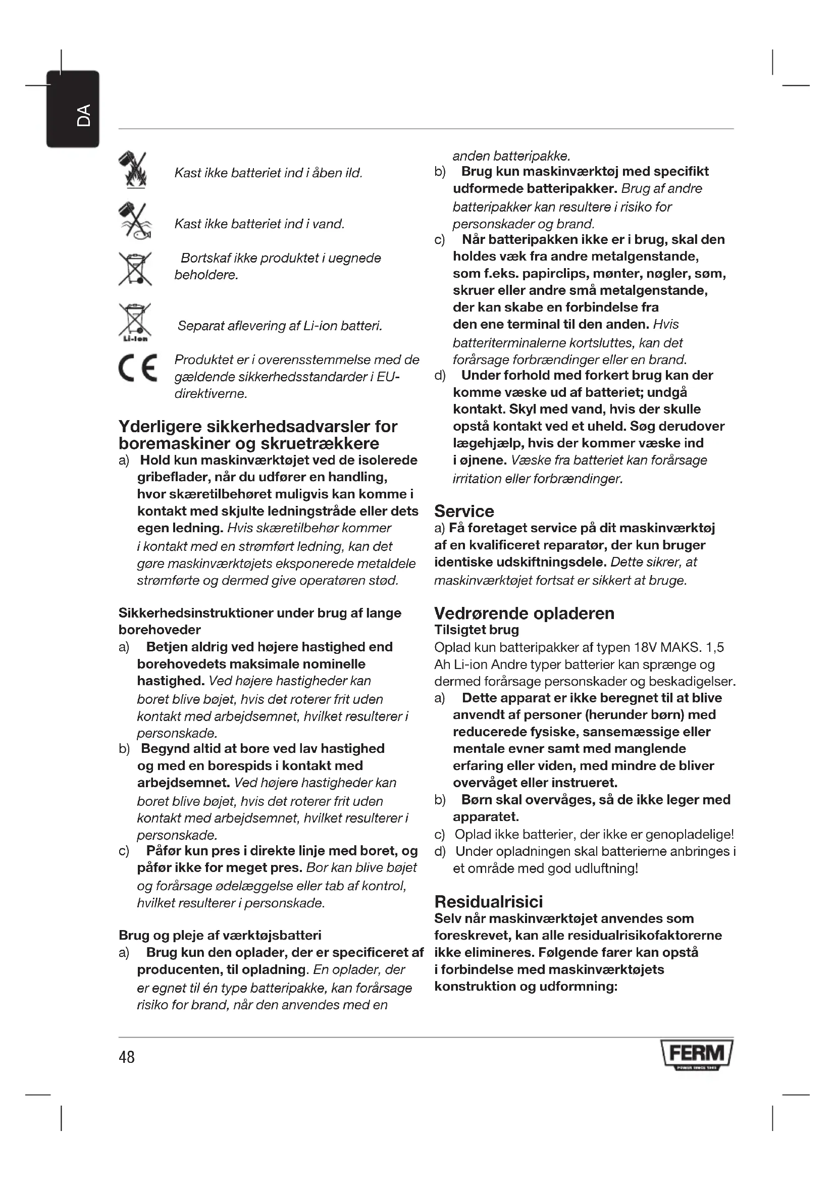 Kast ikke batteriet ind i åben ild. Kast ikke batteriet ind i vand. Bortskaf ikke produktet i uegnede beholdere. Separat aflevering af Li-ion batteri. Produktet er i overensstemmelse med de gældende sikkerhedsstandarder i EU- direktiverne. Yderligere sikkerhedsadvarsler for boremaskiner og skruetrækkere a) Hold kun maskinværktøjet ved de isolerede gribeflader, når du udfører en handling, hvor skæretilbehøret muligvis kan komme i kontakt med skjulte ledningstråde eller dets egen ledning. Hvis skæretilbehør kommer i kontakt med en strømført ledning, kan det gøre maskinværktøjets eksponerede metaldele strømførte og dermed give operatøren stød. Sikkerhedsinstruktioner under brug af lange borehoveder a) Betjen aldrig ved højere hastighed end borehovedets maksimale nominelle hastighed. Ved højere hastigheder kan boret blive bøjet, hvis det roterer frit uden kontakt med arbejdsemnet, hvilket resulterer i personskade. b) Begynd altid at bore ved lav hastighed og med en borespids i kontakt med arbejdsemnet. Ved højere hastigheder kan boret blive bøjet, hvis det roterer frit uden kontakt med arbejdsemnet, hvilket resulterer i personskade. c) Påfør kun pres i direkte linje med boret, og påfør ikke for meget pres. Bor kan blive bøjet og forårsage ødelæggelse eller tab af kontrol, hvilket resulterer i personskade. Brug og pleje af værktøjsbatteri a) Brug kun den oplader, der er specificeret af producenten, til opladning. En oplader, der er egnet til én type batteripakke, kan forårsage risiko for brand, når den anvendes med en anden batteripakke. b) Brug kun maskinværktøj med specifikt udformede batteripakker. Brug af andre batteripakker kan resultere i risiko for personskader og brand. c) Når batteripakken ikke er i brug, skal den holdes væk fra andre metalgenstande, som f.eks. papirclips, mønter, nøgler, søm, skruer eller andre små metalgenstande, der kan skabe en forbindelse fra den ene terminal til den anden. Hvis batteriterminalerne kortsluttes, kan det forårsage forbrændinger eller en brand. d) Under forhold med forkert brug kan der komme væske ud af batteriet; undgå kontakt. Skyl med vand, hvis der skulle opstå kontakt ved et uheld. Søg derudover lægehjælp, hvis der kommer væske ind i øjnene. Væske fra batteriet kan forårsage irritation eller forbrændinger. Service a) Få foretaget service på dit maskinværktøj af en kvalificeret reparatør, der kun bruger identiske udskiftningsdele. Dette sikrer, at maskinværktøjet fortsat er sikkert at bruge. Vedrørende opladeren Tilsigtet brug Oplad kun batteripakker af typen 18V MAKS. 1,5 Ah Li-ion Andre typer batterier kan sprænge og dermed forårsage personskader og beskadigelser. a) Dette apparat er ikke beregnet til at blive anvendt af personer (herunder børn) med reducerede fysiske, sansemæssige eller mentale evner samt med manglende erfaring eller viden, med mindre de bliver overvåget eller instrueret. b) Børn skal overvåges, så de ikke leger med apparatet. c) Oplad ikke batterier, der ikke er genopladelige! d) Under opladningen skal batterierne anbringes i et område med god udluftning! Residualrisici Selv når maskinværktøjet anvendes som foreskrevet, kan alle residualrisikofaktorerne ikke elimineres. Følgende farer kan opstå i forbindelse med maskinværktøjets konstruktion og udformning:49