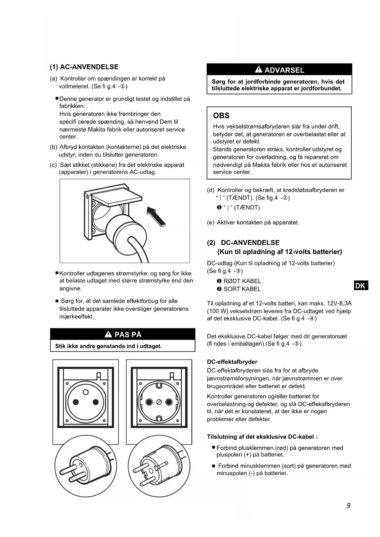 Denne generator er grundigt testet og indstillet på fabrikken. Hvis generatoren ikke frembringer den speci cerede spænding, så henvend Dem til nærmeste Makita fabrik eller autoriseret service center. (b) Afbryd kontakten (kontakterne) på det elektriske udstyr, inden du tilslutter generatoren. (c) Sæt stikket (stikkene) fra det elektriske apparat (apparater) i generatorens AC-udtag.