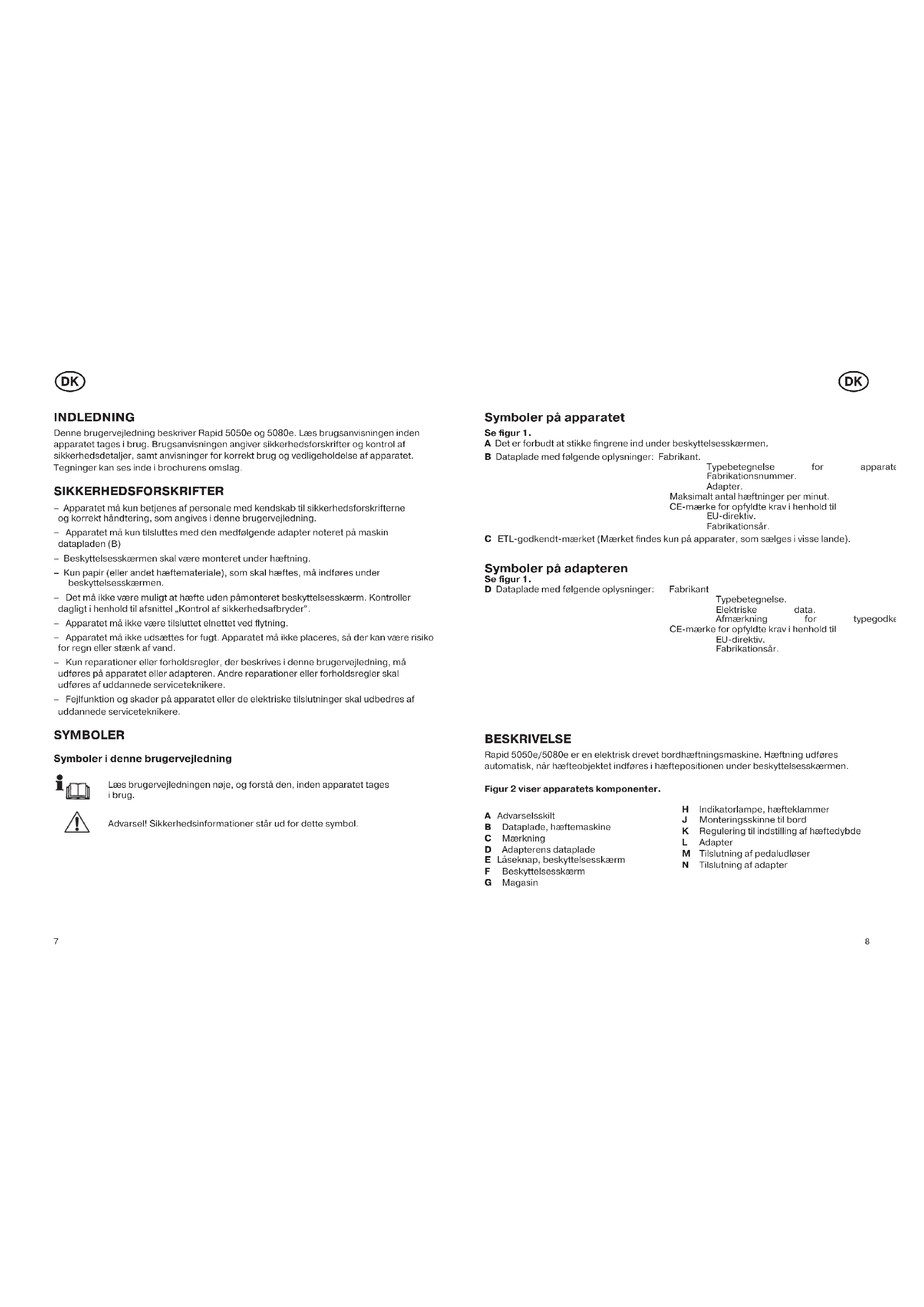 Symboler på apparatet Se figur 1. A Det er forbudt at stikke fingrene ind under beskyttelsesskærmen. B Dataplade med følgende oplysninger: Fabrikant. Typebetegnelse for apparatet. Fabrikationsnummer. Adapter. Maksimalt antal hæftninger per minut. CE-mærke for opfyldte krav i henhold til EU-direktiv. Fabrikationsår. C ETL-godkendt-mærket (Mærket findes kun på apparater, som sælges i visse lande). Symboler på adapteren Se figur 1. D Dataplade med følgende oplysninger: Fabrikant Typebetegnelse. Elektriske data. Afmærkning for typegodkendelse. CE-mærke for opfyldte krav i henhold til EU-direktiv. Fabrikationsår. BESKRIVELSE Rapid 5050e/5080e er en elektrisk drevet bordhæftningsmaskine. Hæftning udføres automatisk, når hæfteobjektet indføres i hæftepositionen under beskyttelsesskærmen. Figur 2 viser apparatets komponenter. A Advarselsskilt B Dataplade, hæftemaskine C Mærkning D Adapterens dataplade E Låseknap, beskyttelsesskærm F Beskyttelsesskærm G Magasin H Indikatorlampe, hæfteklammer J Monteringsskinne til bord K Regulering til indstilling af hæftedybde L Adapter M Tilslutning af pedaludløser N Tilslutning af adapter