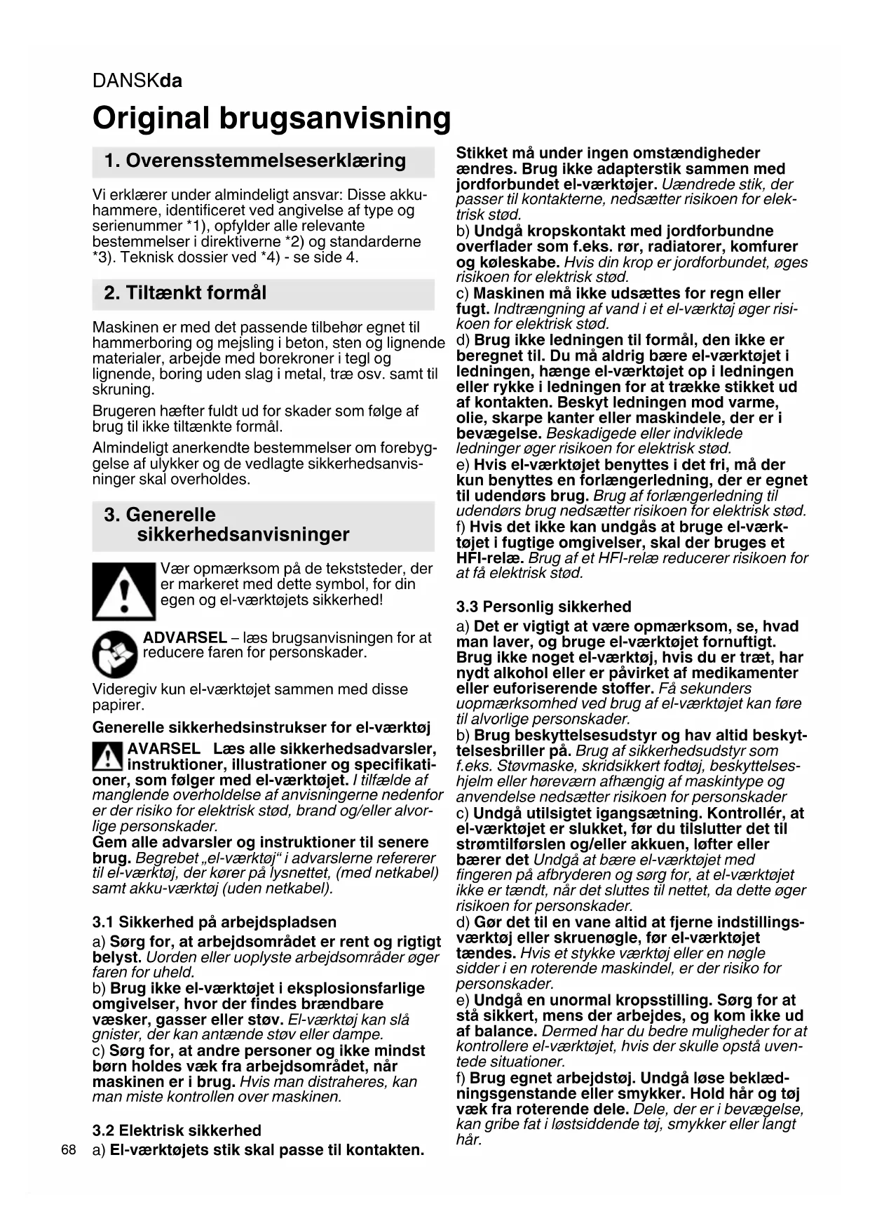 Vi erklærer under almindeligt ansvar: Disse akku- hammere, identificeret ved angivelse af type og serienummer *1), opfylder alle relevante bestemmelser i direktiverne *2) og standarderne *3). Teknisk dossier ved *4) - se side 4. Maskinen er med det passende tilbehør egnet til hammerboring og mejsling i beton, sten og lignende materialer, arbejde med borekroner i tegl og lignende, boring uden slag i metal, træ osv. samt til skruning. Brugeren hæfter fuldt ud for skader som følge af brug til ikke tiltænkte formål. Almindeligt anerkendte bestemmelser om forebyg- gelse af ulykker og de vedlagte sikkerhedsanvis- ninger skal overholdes. Vær opmærksom på de tekststeder, der er markeret med dette symbol, for din egen og el-værktøjets sikkerhed! ADVARSEL – læs brugsanvisningen for at reducere faren for personskader. Videregiv kun el-værktøjet sammen med disse papirer. Generelle sikkerhedsinstrukser for el-værktøj AVARSEL Læs alle sikkerhedsadvarsler, instruktioner, illustrationer og specifikati- oner, som følger med el-værktøjet. I tilfælde af manglende overholdelse af anvisningerne nedenfor er der risiko for elektrisk stød, brand og/eller alvor- lige personskader. Gem alle advarsler og instruktioner til senere brug. Begrebet „el-værktøj“ i advarslerne refererer til el-værktøj, der kører på lysnettet, (med netkabel) samt akku-værktøj (uden netkabel).