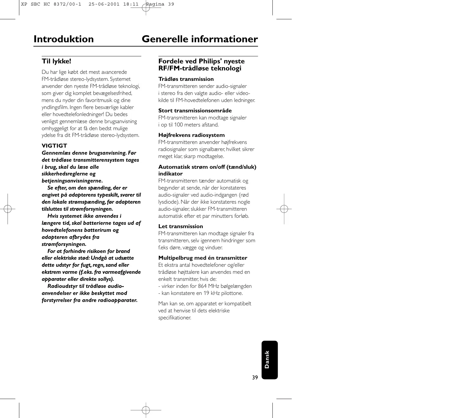 25-06-2001 18:11 Introduktion Til lykke! Du har lige købt det mest avancerede FM-trådløse stereo-lydsystem. Systemet anvender den nyeste FM-trådløse teknologi, som giver dig komplet bevægelsesfrihed, mens du nyder din favoritmusik og dine yndlingsfilm. Ingen flere besværlige kabler eller hovedtelefonledninger! Du bedes venligst gennemlæse denne brugsanvisning omhyggeligt for at få den bedst mulige ydelse fra dit FM-trådløse stereo-lydsystem. VIGTIGT Gennemlæs denne brugsanvisning. Før det trådløse transmitterensystem tages i brug, skal du læse alle sikkerhedsreglerne og betjeningsanvisningerne. Se efter, om den spænding, der er angivet på adapterens typeskilt, svarer til den lokale strømspænding, før adapteren tilsluttes til strømforsyningen. Hvis systemet ikke anvendes i længere tid, skal batterierne tages ud af hovedtelefonens batterirum og adapteren afbrydes fra strømforsyningen. For at forhindre risikoen for brand eller elektriske stød: Undgå at udsætte dette udstyr for fugt, regn, sand eller ekstrem varme (f.eks. fra varmeafgivende apparater eller direkte sollys). Radioudstyr til trådløse audioanvendelser er ikke beskyttet mod forstyrrelser fra andre radioapparater. Pagina 39 Generelle informationer Fordele ved Philips' nyeste RF/FM-trådløse teknologi Trådløs transmission FM-transmitteren sender audio-signaler i stereo fra den valgte audio- eller videokilde til FM-hovedtelefonen uden ledninger. Stort transmissionsområde FM-transmitteren kan modtage signaler i op til 100 meters afstand. Højfrekvens radiosystem FM-transmitteren anvender højfrekvens radiosignaler som signalbærer, hvilket sikrer meget klar, skarp modtagelse. Automatisk strøm on/off (tænd/sluk) indikator FM-transmitteren tænder automatisk og begynder at sende, når der konstateres audio-signaler ved audio-indgangen (rød lysdiode). Når der ikke konstateres nogle audio-signaler, slukker FM-transmitteren automatisk efter et par minutters forløb. Let transmission FM-transmitteren kan modtage signaler fra transmitteren, selv igennem hindringer som f.eks døre, vægge og vinduer. Multipelbrug med én transmitter Et ekstra antal hovedtelefoner og/eller trådløse højttalere kan anvendes med en enkelt transmitter, hvis de: - virker inden for 864 MHz bølgelængden - kan konstatere en 19 kHz pilottone. Man kan se, om apparatet er kompatibelt ved at henvise til dets elektriske specifikationer. Dansk