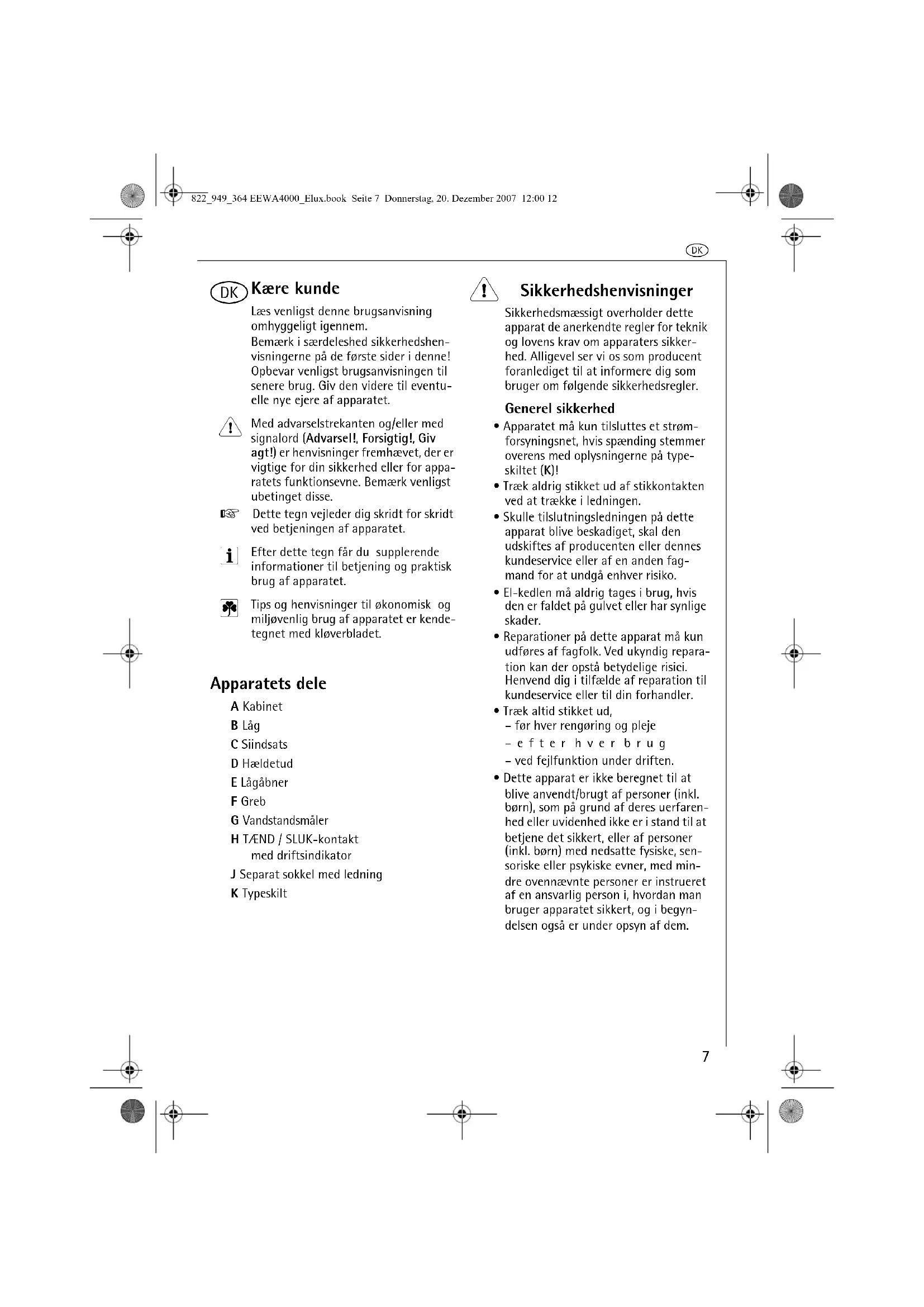 Kære kunde Læs venligst denne brugsanvisning omhyggeligt igennem.Bemærk i særdeleshed sikkerhedshen-visningerne på de første sider i denne! Opbevar venligst brugsanvisningen til senere brug. Giv den videre til eventu-elle nye ejere af apparatet. Med advarselstrekanten og/eller med signalord (Advarsel!, Forsigtig!, Giv agt!) er henvisninger fremhævet, der er vigtige for din sikkerhed eller for appa-ratets funktionsevne. Bemærk venligst ubetinget disse.0 Dette tegn vejleder dig skridt for skridt ved betjeningen af apparatet. Efter dette tegn får du supplerende informationer til betjening og praktisk brug af apparatet. Tips og henvisninger til økonomisk og miljøvenlig brug af apparatet er kende-tegnet med kløverbladet. Apparatets dele A KabinetB LågC SiindsatsD HældetudE LågåbnerF GrebG VandstandsmålerH TÆND / SLUK-kontakt med driftsindikatorJ Separat sokkel med ledningK Typeskilt 1 Sikkerhedshenvisninger Sikkerhedsmæssigt overholder dette apparat de anerkendte regler for teknik og lovens krav om apparaters sikker-hed. Alligevel ser vi os som producent foranlediget til at informere dig som bruger om følgende sikkerhedsregler.Generel sikkerhed• Apparatet må kun tilsluttes et strøm-forsyningsnet, hvis spænding stemmer overens med oplysningerne på type-skiltet (K)!• Træk aldrig stikket ud af stikkontakten ved at trække i ledningen.• Skulle tilslutningsledningen på dette apparat blive beskadiget, skal den udskiftes af producenten eller dennes kundeservice eller af en anden fag-mand for at undgå enhver risiko.• El-kedlen må aldrig tages i brug, hvis den er faldet på gulvet eller har synlige skader. • Reparationer på dette apparat må kun udføres af fagfolk. Ved ukyndig repara-tion kan der opstå betydelige risici. Henvend dig i tilfælde af reparation til kundeservice eller til din forhandler.• Træk altid stikket ud,– før hver rengøring og pleje–efter hver brug– ved fejlfunktion under driften.• Dette apparat er ikke beregnet til at blive anvendt/brugt af personer (inkl. børn), som på grund af deres uerfaren-hed eller uvidenhed ikke er i stand til at betjene det sikkert, eller af personer (inkl. børn) med nedsatte fysiske, sen-soriske eller psykiske evner, med min-dre ovennævnte personer er instrueret af en ansvarlig person i, hvordan man bruger apparatet sikkert, og i begyn-delsen også er under opsyn af dem.822_949_364 EEWA4000_Elux.book Seite 7 Donnerstag, 20. Dezember 2007 12:00 12k