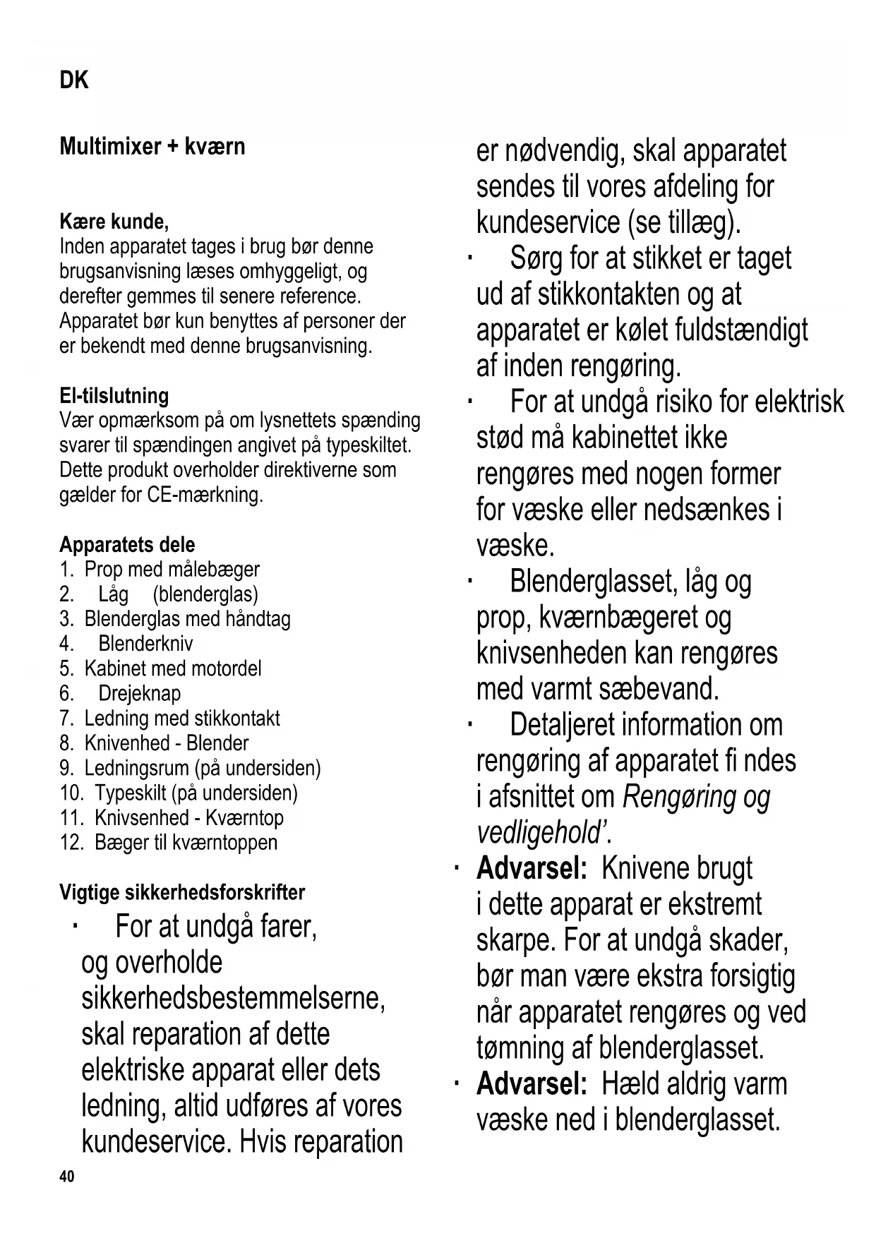 Vigtige sikkerhedsforskrifter ∙ For at undgå farer, og overholde sikkerhedsbestemmelserne, skal reparation af dette elektriske apparat eller dets ledning, altid udføres af vores kundeservice. Hvis reparation er nødvendig, skal apparatet sendes til vores afdeling for kundeservice (se tillæg). ∙ Sørg for at stikket er taget ud af stikkontakten og at apparatet er kølet fuldstændigt af inden rengøring. ∙ For at undgå risiko for elektrisk stød må kabinettet ikke rengøres med nogen former for væske eller nedsænkes i væske. ∙ Blenderglasset, låg og prop, kværnbægeret og knivsenheden kan rengøres med varmt sæbevand. ∙ Detaljeret information om rengøring af apparatet fi ndes i afsnittet om Rengøring og vedligehold’. ∙ Advarsel: Knivene brugt i dette apparat er ekstremt skarpe. For at undgå skader, bør man være ekstra forsigtig når apparatet rengøres og ved tømning af blenderglasset. ∙ Advarsel: Hæld aldrig varm væske ned i blenderglasset. DK41 ∙ Vær ekstra forsigtig med at hælde varme væsker i blenderglasset, da der er risiko for at skoldhed vanddamp kan skyde op af apparatet. ∙ Kom kun små mængder væske (f.eks. olie til pesto) i kværntoppen. ∙ Advarsel: Misbrug kan forårsage alvorlig personskade. ∙ Sluk altid for blenderen og tag stikket ud af stikkontakten, - når apparatet ikke er under opsyn, - inden låget åbnes, - inden aftagning eller påsætning af blenderglasset eller kværntoppen, - i tilfælde af fejlfunktion under brug, - inden rengøring, - efter brug. ∙ Træk aldrig i selve ledningen, når ledningen tages ud af stikkontakten; tag altid fat i selve stikket. ∙ Dette apparat er beregnet til privat brug eller i tilsvarende omgivelser, såsom - i tekøkkener, kontorer eller andre mindre virksomheder, - landbrugsvirksomheder, - af kunder på hoteller, moteller m.m. og tilsvarende foretagender, - B&B pensionater. ∙ Apparatet må ikke benyttes af personer med reducerede fysiske, sensoriske eller mentale evner, eller mangel på erfaring eller viden, medmindre de har fået vejledning og instruktion i brugen af dette apparat og fuldt ud forstår alle farer og forholdsregler vedrørende sikkerheden som brug af apparatet medfører. ∙ Børn må aldrig gives lov til at benytte dette apparat. Apparatet og dets ledning må altid holdes langt væk fra børn. ∙ Børn må aldrig få lov til at lege med apparatet. ∙ Advarsel: Hold altid børn væk fra emballagen eftersom den udgør en potentiel fare. Der er f.eks. risiko for kvælning.42 ∙ Inden apparatet benyttes må både apparatet og dets tilbehør ses grundigt efter for fejl. Hvis apparatet for eksempel har været tabt på en hård overfl ade eller der er blevet trukket i ledningen med stor kraft, må det ikke længere benyttes: Selv skader der ikke er synlige kan have ugunstig indvirkning på sikkerheden ved brug af apparatet. ∙ Apparatet bør altid placeres på en plan overfl ade. Lad ikke kabinettet eller ledningen komme i kontakt med åben ild eller med varme overfl ader såsom kogeplader. ∙ Lad ikke ledningen hænge løst ud over bordkanten. ∙ Rør aldrig ved bevægelige dele under brug - dette kan være yderst farligt. ∙ Vi påtager os intet ansvar for skader, der skyldes misbrug eller manglende overholdelse af denne brugsanvisning. Før brug Inden blenderen tages i brug første gang, bør blenderglasset, låget og proppen, kværnbægeret og knivsenheden vaskes grundigt som beskrevet i afsnittet om Rengøring og vedligehold. Indstillinger De følgende indstillinger kan benyttes: P Apparatet kører med fuld effekt så længe drejeknappen holdes på denne position 0 Blenderen er slukket I Lav effekt II Maksimal effekt Kort tids betjening Blenderen er kun beregnet til at bearbejde almindelige husholdningers madportioner. Den kan maksimalt betjenes i 3 minutter uden afbrydelse, eller i op til 30 sekunder med kværntoppen, hvorefter den bør få tid til at køle ned til stuetemperatur. Sikkerhedskontakt En speciel sikkerhedskontakt på kabinettets motordel sikrer at apparatet kun kan betjenes, når blenderglasset eller kværnenheden er korrekt påsat og låst. Sørg altid for at drejeknappen står på positionen 0, inden nogen af delene tages af. Dette gælder også når blenderglasset eller kværntoppen skal sættes på motordelen. Hvis ikke drejeknappen er sat hen på ‘slukket’ positionen (0), vil motoren starte umiddelbart. Multi-mixer betjening ∙ Sæt blenderglasset ned i rillen på kabinettet med motordelen, så håndtaget vender mod højre og med de to trekantsmarkeringer overfor hinanden. ∙ Hæld de fl ydende ingredienser i blenderglasset. Glasset kan maksimalt rumme 1000 ml. For at undgå at det skummer eller render over, når man bearbejder skummende eller tynde væsker såsom mælk, bør glasset da ikke fyldes over 700 ml mærket. ∙ Sæt låget på så hældetuden er fuldstændigt dækket. ∙ Låget skal altid være sat på blenderen er i drift. ∙ For at tilsætte yderligere ingredienser under betjeningen, kan proppen i midten af låget tages ud. Før aldrig nogen genstande eller køkkenredskaber ind i43 blenderglasset, når blenderen kører. ∙ Sæt stikket i stikkontakten og brug drejeknappen til at vælge den ønskede indstilling. ∙ Advarsel: Kør aldrig blenderen når blenderglasset er tomt. Den bør heller aldrig fyldes med udelukkende tørre ting, såsom nødder, mandler etc. ∙ Efter brug, sættes drejeknappen hen på “0” og stikket tages ud af stikkontakten. Vent med at tage blenderglasset af indtil motoren er fuldstændigt standset. Brug af multi-mixeren til at knuse isterninger Isterninger kan let knuses i blenderglasset: Fyld glasset kvart fuldt med isterninger, og sæt det på kabinettet med motordelen, som beskrevet i afsnittet Multi-mixer betjening. Sæt låget på med proppen i, og brug puls funktionen (P) til at betjene apparatet i ca. 2 sekunder. Vent til isterningerne har samlet sig på bunden af glasset igen og gent
