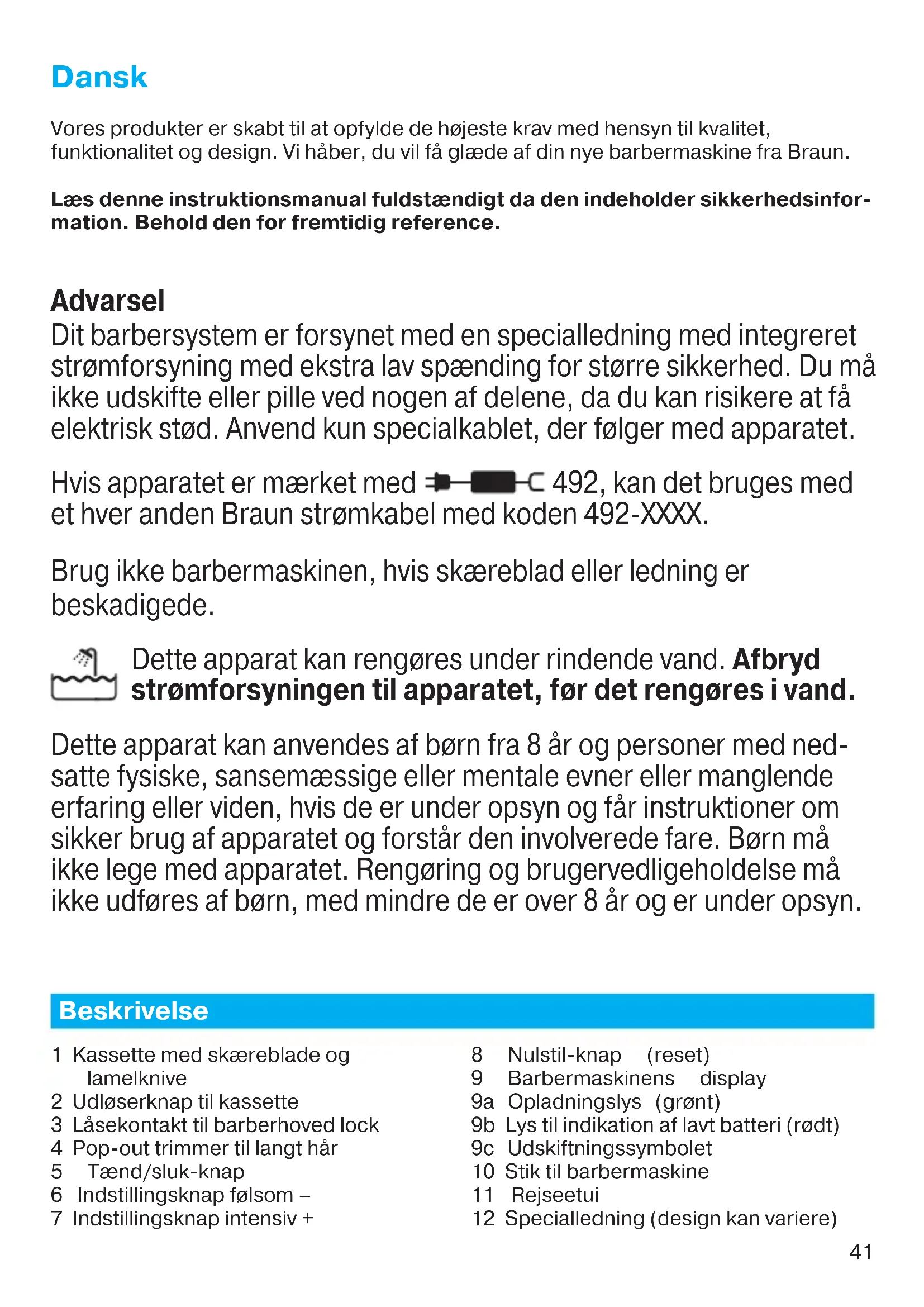 cassette weken in warm water waaraan een druppeltje afwasmiddel is toegevoegd. Spoel ze daarna zorgvuldig af en schud het overtollige water eraf. Breng een druppeltje lichte machineolie aan wanneer het apparaat is opgedroogd. Scheerapparaat schakelt uit terwijl de batterij volledig opge laden is. Scheerblad en messenblok zijn versleten wat meer vermogen vereist dan de motor aankan. Het apparaat schakelt dan vanzelf uit. – Vervang scheerblad & messenblok cassette. – Smeer regelmatig het scheer- systeem met olie, zeker wanneer het uitsluitend met water gereinigd wordt. Het batterij- symbooltje in het scherm verspringt naar het teken dat de batterij leeg aan het raken is. Scheerblad en messenblok zijn versleten wat meer vermogen vereist per scheerbeurt. – Vervang scheerblad & messenblok cassette. – Smeer regelmatig het scheer- systeem met olie, zeker wanneer het uitsluitend met water gereinigd wordt. De scheerele- menten zijn on- langs vervan- gen, maar het indicatielampje “vervangen snijelementen” licht op. De resetknop is niet ingedrukt. – Houd de resetknop tenminste 3 seconden ingedrukt om de teller te resetten. 91153500_Series_7-8_Solo_EURO_S6-140.indd 4091153500_Series_7-8_Solo_EURO_S6-140.indd 40 28.11.16 13:4228.11.16 13:42 CSS APPROVED Effective Date 30Nov2016 GMT - Printed 04Jan2017 Page 39 of 13941 Dansk Vores produkter er skabt til at opfylde de højeste krav med hensyn til kvalitet, funktionalitet og design. Vi håber, du vil få glæde af din nye barbermaskine fra Braun. Læs denne instruktionsmanual fuldstændigt da den indeholder sikkerhedsinfor- mation. Behold den for fremtidig reference. Advarsel Dit barbersystem er forsynet med en specialledning med integreret strømforsyning med ekstra lav spænding for større sikkerhed. Du må ikke udskifte eller pille ved nogen af delene, da du kan risikere at få elektrisk stød. Anvend kun specialkablet, der følger med apparatet. Hvis apparatet er mærket med 492, kan det bruges med et hver anden Braun strømkabel med koden 492-XXXX. Brug ikke barbermaskinen, hvis skæreblad eller ledning er beskadigede. Dette apparat kan rengøres under rindende vand. Afbryd strømforsyningen til apparatet, før det rengøres i vand. Dette apparat kan anvendes af børn fra 8 år og personer med ned- satte fysiske, sansemæssige eller mentale evner eller manglende erfaring eller viden, hvis de er under opsyn og får instruktioner om sikker brug af apparatet og forstår den involverede fare. Børn må ikke lege med apparatet. Rengøring og brugervedligeholdelse må ikke udføres af børn, med mindre de er over 8 år og er under opsyn. Beskrivelse 1 Kassette med skæreblade og lamelknive 2 Udløserknap til kassette 3 Låsekontakt til barberhoved lock 4 Pop-out trimmer til langt hår 5 Tænd/sluk-knap 6 Indstillingsknap følsom – 7 Indstillingsknap intensiv + 8 Nulstil-knap (reset) 9 Barbermaskinens display 9a Opladningslys (grønt) 9b Lys til indikation af lavt batteri (rødt) 9c Udskiftningssymbolet 10 Stik til barbermaskine 11 Rejseetui 12 Specialledning (design kan variere) 91153500_Series_7-8_Solo_EURO_S6-140.indd 4191153500_Series_7-8_Solo_EURO_S6-140.indd 41 28.11.16 13:4228.11.16 13:42 CSS APPROVED Effective Date 30Nov2016 GMT - Printed 04Jan2017 Page 40 of 13942 Opladning af shaver Anbefalet temperatur ved opladning er 5 °C til 35 °C. Batteriet oplades måske ikke ordentligt eller slet ikke ved en ekstremt lav eller høj temperatur. Anbefalet temperatur ved opbevaring og barbering er 15 °C til 35 °C. Apparatet må ikke udsættes for temperaturer over 50 °C i længere perioder.