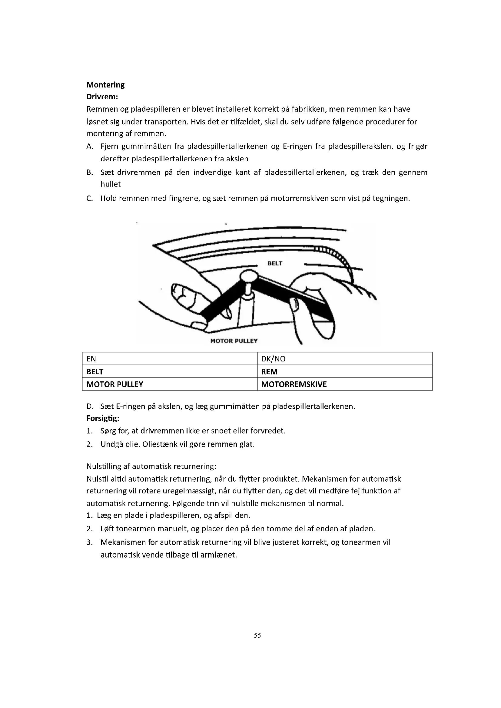 - Anvisningerne er udelukkende beregnet til produkter, der anvender strømkabel eller strømforsyning til vekselstrøm. Oplysninger om strømadapter Strømforsyning - Producent: Shenzhen Andsmps Electronic Technology Co., Ltd - Modelnr.: AS013W-1201000ZC - Adaptertype: Ekstern AC-adapter - Brug kun den strømforsyning, der er angivet i betjeningsvejledningen Information Værdi og præcision Producentens navn eller varemærke, handelsregistrering og adresse - Andsmps Electronic Technology Co., Ltd 201, No 18 Munfu Road, Sha Tou Industrial Park, Sha Tou Community, Sha Jing Street, Baoan District, Shenzhen City, Guangdong China Modelnr - AS013W-1201000ZC Indgangsspænding 100-240 V vekselstrøm AC-indgangsfrekvens 50/60 H Udgangsspænding 12,0 V Udgangsstrøm 1,0 A Udgangseffekt 12 W Gennemsnitlig effektivitet i aktiv tilstand 82,96% Effektivitet ved lav belastning (10%) 79,95% Strømforbrug ved ingen belastning ≤0,075 W55 Montering Drivrem: Remmen og pladespilleren er blevet installeret korrekt på fabrikken, men remmen kan have løsnet sig under transporten. Hvis det er tilfældet, skal du selv udføre følgende procedurer for montering af remmen. A. Fjern gummimåtten fra pladespillertallerkenen og E-ringen fra pladespillerakslen, og frigør derefter pladespillertallerkenen fra akslen B. Sæt drivremmen på den indvendige kant af pladespillertallerkenen, og træk den gennem hullet C. Hold remmen med fingrene, og sæt remmen på motorremskiven som vist på tegningen.