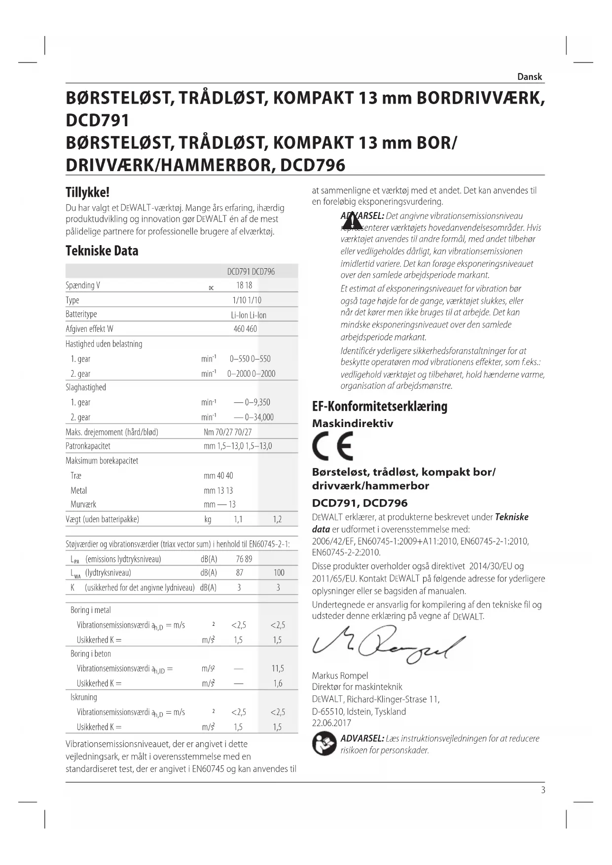 Disse produit overholder ogss direktivet 2014/30/EU og 2011/65/EU. Kontakt DEWALT pa falgende adrasse for yderligere ophysninger erer se bagsiden af manualen.
