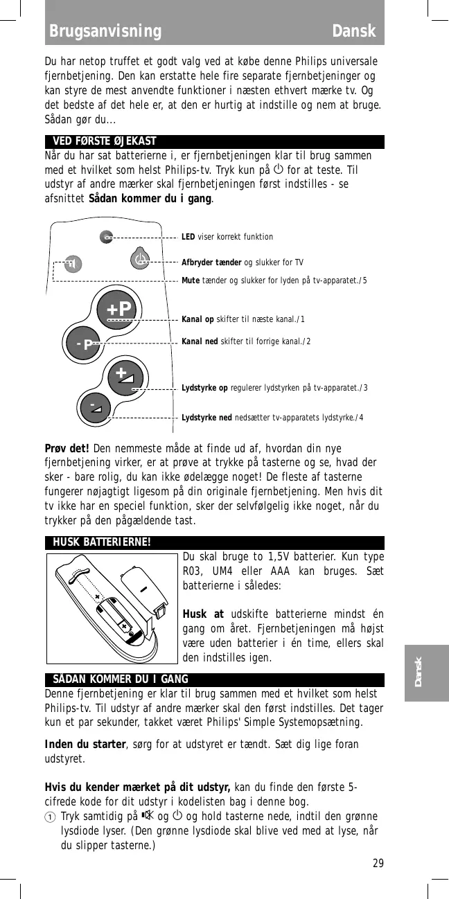RU455- page 29 Brugsanvisning Dansk Du har netop truffet et godt valg ved at købe denne Philips universale fjernbetjening. Den kan erstatte hele fire separate fjernbetjeninger og kan styre de mest anvendte funktioner i næsten ethvert mærke tv. Og det bedste af det hele er, at den er hurtig at indstille og nem at bruge. Sådan gør du...