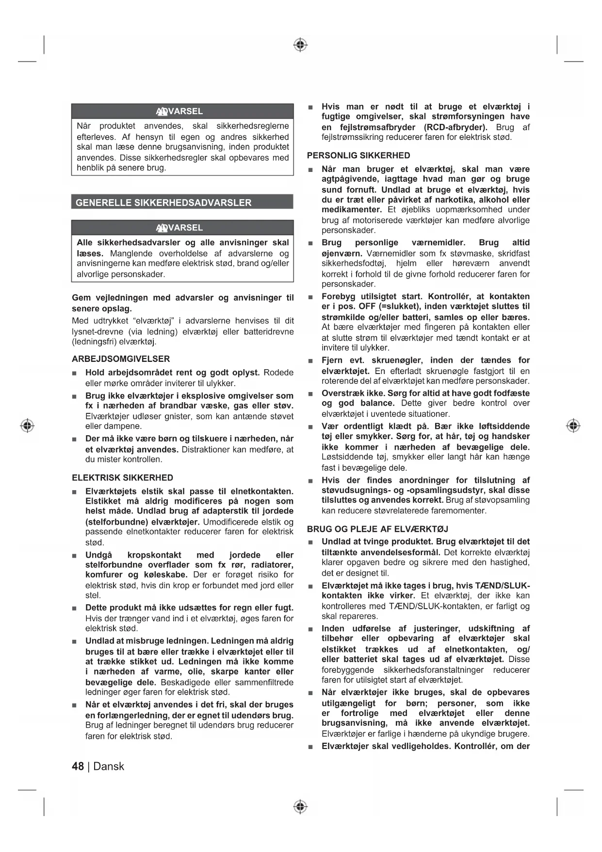 Ŷ Undlad at tvinge produktet. Brug elværktøjet til det tiltænkte anvendelsesformål. Det korrekte elværktøj klarer opgaven bedre og sikrere med den hastighed, det er designet til. Ŷ Elværktøjet må ikke tages i brug, hvis TÆND/SLUK- kontakten ikke virker. Et elværktøj, der ikke kan kontrolleres med TÆND/SLUK-kontakten, er farligt og skal repareres. Ŷ Inden udførelse af justeringer, udskiftning af tilbehør eller opbevaring af elværktøjer skal elstikket trækkes ud af elnetkontakten, og/ eller batteriet skal tages ud af elværktøjet. Disse forebyggende sikkerhedsforanstaltninger reducerer faren for utilsigtet start af elværktøjet. Ŷ Når elværktøjer ikke bruges, skal de opbevares utilgængeligt for børn; personer, som ikke er fortrolige med elværktøjet eller denne brugsanvisning, må ikke anvende elværktøjet. Elværktøjer er farlige i hænderne på ukyndige brugere. Ŷ Elværktøjer skal vedligeholdes. Kontrollér, om der49 Dansk |