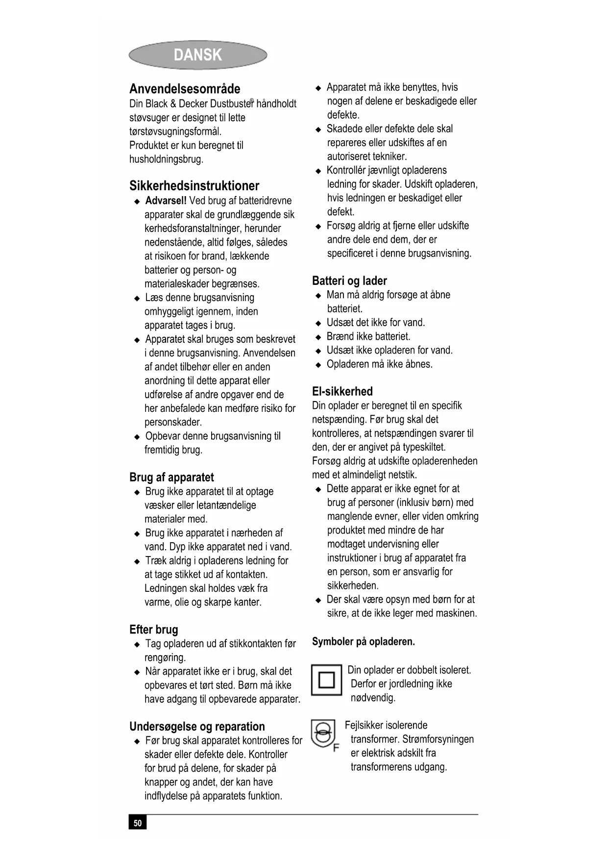 håndholdt støvsuger er designet til lette tørstøvsugningsformål. Produktet er kun beregnet til husholdningsbrug. Sikkerhedsinstruktioner Advarsel! Ved brug af batteridrevne apparater skal de grundlæggende sik kerhedsforanstaltninger, herunder nedenstående, altid følges, således at risikoen for brand, lækkende batterier og person- og materialeskader begrænses. Læs denne brugsanvisning omhyggeligt igennem, inden apparatet tages i brug. Apparatet skal bruges som beskrevet i denne brugsanvisning. Anvendelsen af andet tilbehør eller en anden anordning til dette apparat eller udførelse af andre opgaver end de her anbefalede kan medføre risiko for personskader. Opbevar denne brugsanvisning til fremtidig brug. Brug af apparatet Brug ikke apparatet til at optage væsker eller letantændelige materialer med. Brug ikke apparatet i nærheden af vand. Dyp ikke apparatet ned i vand. Træk aldrig i opladerens ledning for at tage stikket ud af kontakten. Ledningen skal holdes væk fra varme, olie og skarpe kanter. Efter brug Tag opladeren ud af stikkontakten før rengøring. Når apparatet ikke er i brug, skal det opbevares et tørt sted. Børn må ikke have adgang til opbevarede apparater. Undersøgelse og reparation Før brug skal apparatet kontrolleres for skader eller defekte dele. Kontroller for brud på delene, for skader på knapper og andet, der kan have indflydelse på apparatets funktion. Apparatet må ikke benyttes, hvis nogen af delene er beskadigede eller defekte. Skadede eller defekte dele skal repareres eller udskiftes af en autoriseret tekniker. Kontrollér jævnligt opladerens ledning for skader. Udskift opladeren, hvis ledningen er beskadiget eller defekt. Forsøg aldrig at fjerne eller udskifte andre dele end dem, der er specificeret i denne brugsanvisning. Batteri og lader Man må aldrig forsøge at åbne batteriet. Udsæt det ikke for vand. Brænd ikke batteriet. Udsæt ikke opladeren for vand. Opladeren må ikke åbnes. El-sikkerhed Din oplader er beregnet til en specifik netspænding. Før brug skal det kontrolleres, at netspændingen svarer til den, der er angivet på typeskiltet. Forsøg aldrig at udskifte opladerenheden med et almindeligt netstik. Dette apparat er ikke egnet for at brug af personer (inklusiv børn) med manglende evner, eller viden omkring produktet med mindre de har modtaget undervisning eller instruktioner i brug af apparatet fra en person, som er ansvarlig for sikkerheden. Der skal være opsyn med børn for at sikre, at de ikke leger med maskinen. Symboler på opladeren. Din oplader er dobbelt isoleret. Derfor er jordledning ikke nødvendig. Fejlsikker isolerende transformer. Strømforsyningen er elektrisk adskilt fra transformerens udgang.51 DANSK Opladeren afbrydes automatisk, hvis den omgivende temperatur bliver for høj. Som følge heraf kan opladeren ikke længere fungere. Denne enhed skal afbrydes fra strømforsyningen og bringes til reparation på autoriseret serviceværksted. Opladeren er kun beregnet til indendørs brug. Læs brugsanvisningen omhyggeligt igennem, inden apparatet tages i brug. Advarsel! Hold elektriske apparater væk fra børn eller usikre personer. Lad dem ikke anvende apparater uden opsyn. Funktioner