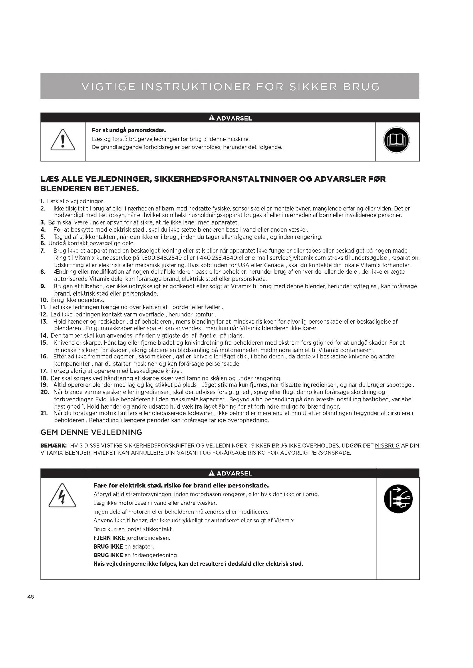 ADVARSEL For at undgå personskader. Læs og forstå brugervejledningen før brug af denne maskine.De grundlæggende forholdsregler bør overholdes, herunder det følgende. ADVARSEL Fare for elektrisk stød, risiko for brand eller personskade. Afbryd altid strømforsyningen, inden motorbasen rengøres, eller hvis den ikke er i brug.Læg ikke motorbasen i vand eller andre væsker. Ingen dele af motoren eller beholderen må ændres eller modificeres. Anvend ikke tilbehør, der ikke udtrykkeligt er autoriseret eller solgt af Vitamix. Brug kun en jordet stikkontakt. FJERN IKKE jordforbindelsen. BRUG IKKE en adapter. BRUG IKKE en forlængerledning. Hvis vejledningerne ikke følges, kan det resultere i dødsfald eller elektrisk stød.