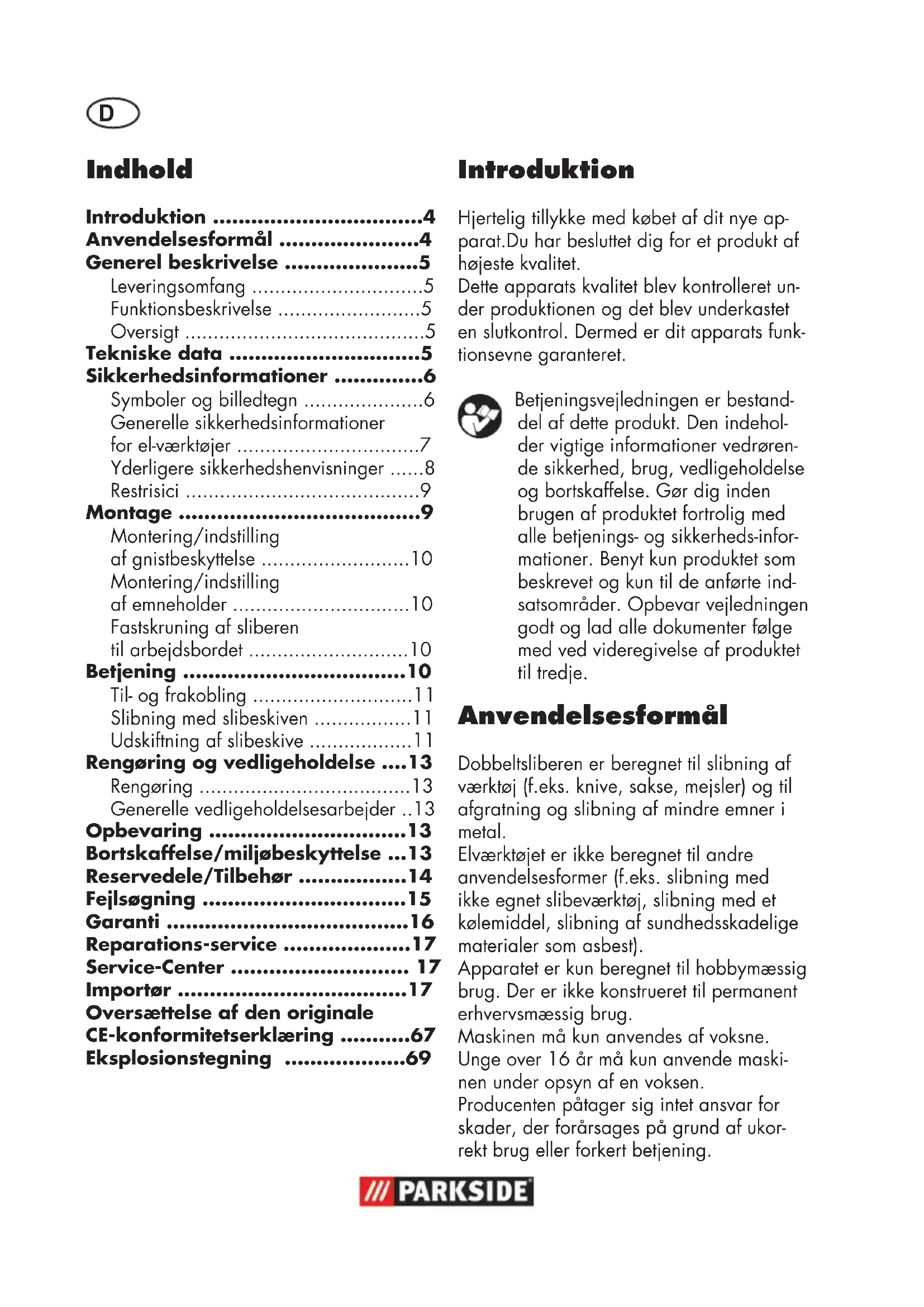 - Introduktion Hjertelig tillykke med købet af dit nye ap- parat.Du har besluttet dig for et produkt af højeste kvalitet. Dette apparats kvalitet blev kontrolleret un- der produktionen og det blev underkastet en slutkontrol. Dermed er dit apparats funk- tionsevne garanteret. Betjeningsvejledningen er bestand- del af dette produkt. Den indehol- der vigtige informationer vedrøren- de sikkerhed, brug, vedligeholdelse og bortskaffelse. Gør dig inden brugen af produktet fortrolig med alle betjenings- og sikkerheds-infor- mationer. Benyt kun produktet som beskrevet og kun til de anførte ind- satsområder. Opbevar vejledningen godt og lad alle dokumenter følge med ved videregivelse af produktet til tredje. Anvendelsesformål Dobbeltsliberen er beregnet til slibning af værktøj (f.eks. knive, sakse, mejsler) og til afgratning og slibning af mindre emner i metal. Elværktøjet er ikke beregnet til andre anvendelsesformer (f.eks. slibning med ikke egnet slibeværktøj, slibning med et kølemiddel, slibning af sundhedsskadelige materialer som asbest). Apparatet er kun beregnet til hobbymæssig brug. Der er ikke konstrueret til permanent erhvervsmæssig brug. Maskinen må kun anvendes af voksne. Unge over 16 år må kun anvende maski- nen under opsyn af en voksen. Producenten påtager sig intet ansvar for skader, der forårsages på grund af ukor- rekt brug eller forkert betjening. Oversættelse af den originale CE-konformitetserklæring p. 67