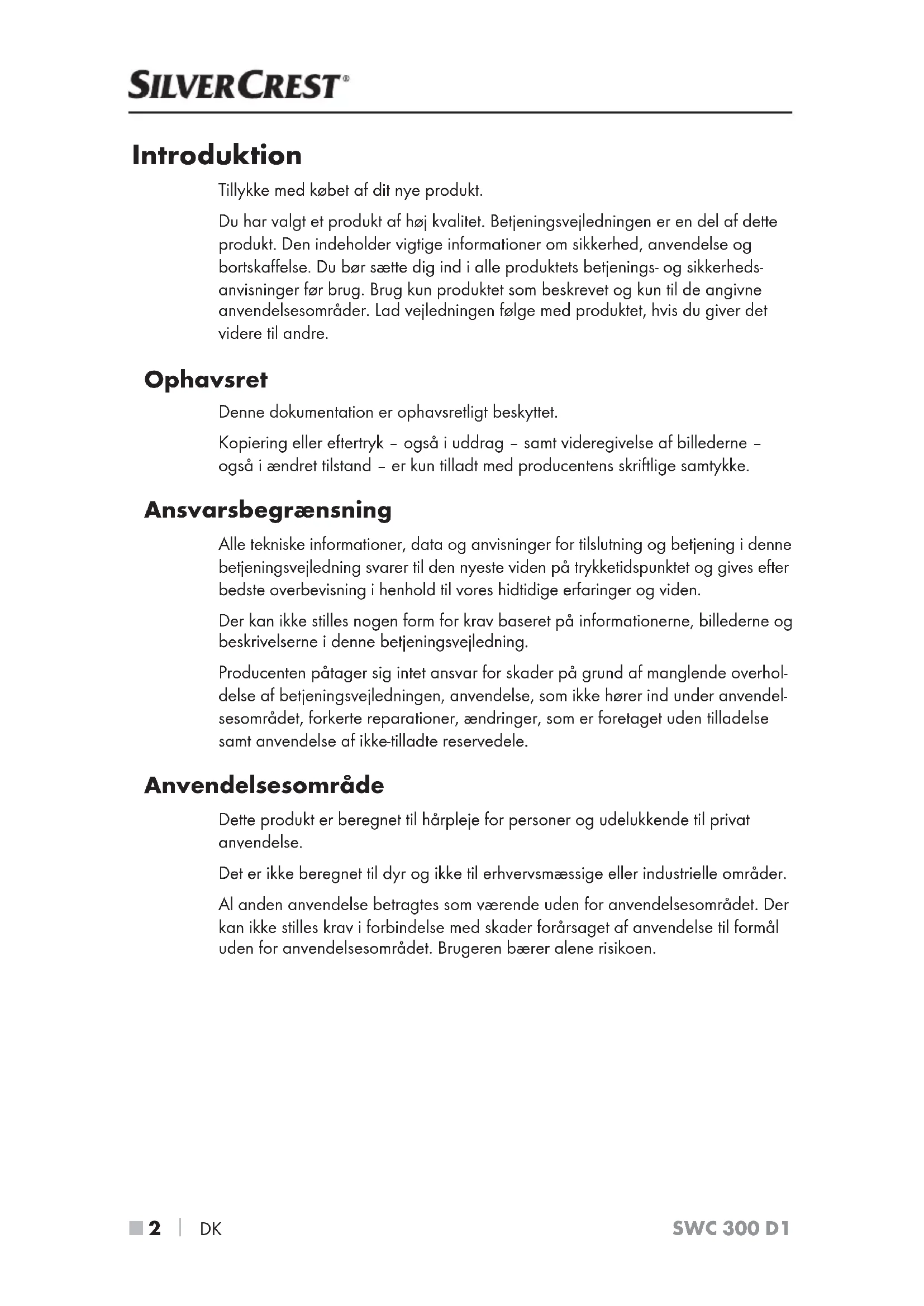 DK SWC 300 D1 Introduktion Tillykke med købet af dit nye produkt. Du har valgt et produkt af høj kvalitet. Betjeningsvejledningen er en del af dette produkt. Den indeholder vigtige informationer om sikkerhed, anvendelse og bortskaffelse. Du bør sætte dig ind i alle produktets betjenings- og sikkerheds- anvisninger før brug. Brug kun produktet som beskrevet og kun til de angivne anvendelsesområder. Lad vejledningen følge med produktet, hvis du giver det videre til andre. Ophavsret Denne dokumentation er ophavsretligt beskyttet. Kopiering eller eftertryk – også i uddrag – samt videregivelse af billederne – også i ændret tilstand – er kun tilladt med producentens skriftlige samtykke. Ansvarsbegrænsning Alle tekniske informationer, data og anvisninger for tilslutning og betjening i denne betjeningsvejledning svarer til den nyeste viden på trykketidspunktet og gives efter bedste overbevisning i henhold til vores hidtidige erfaringer og viden. Der kan ikke stilles nogen form for krav baseret på informationerne, billederne og beskrivelserne i denne betjeningsvejledning. Producenten påtager sig intet ansvar for skader på grund af manglende overhol- delse af betjeningsvejledningen, anvendelse, som ikke hører ind under anvendel- sesområdet, forkerte reparationer, ændringer, som er foretaget uden tilladelse samt anvendelse af ikke-tilladte reservedele. Anvendelsesområde Dette produkt er beregnet til hårpleje for personer og udelukkende til privat anvendelse. Det er ikke beregnet til dyr og ikke til erhvervsmæssige eller industrielle områder. Al anden anvendelse betragtes som værende uden for anvendelsesområdet. Der kan ikke stilles krav i forbindelse med skader forårsaget af anvendelse til formål uden for anvendelsesområdet. Brugeren bærer alene risikoen.DK