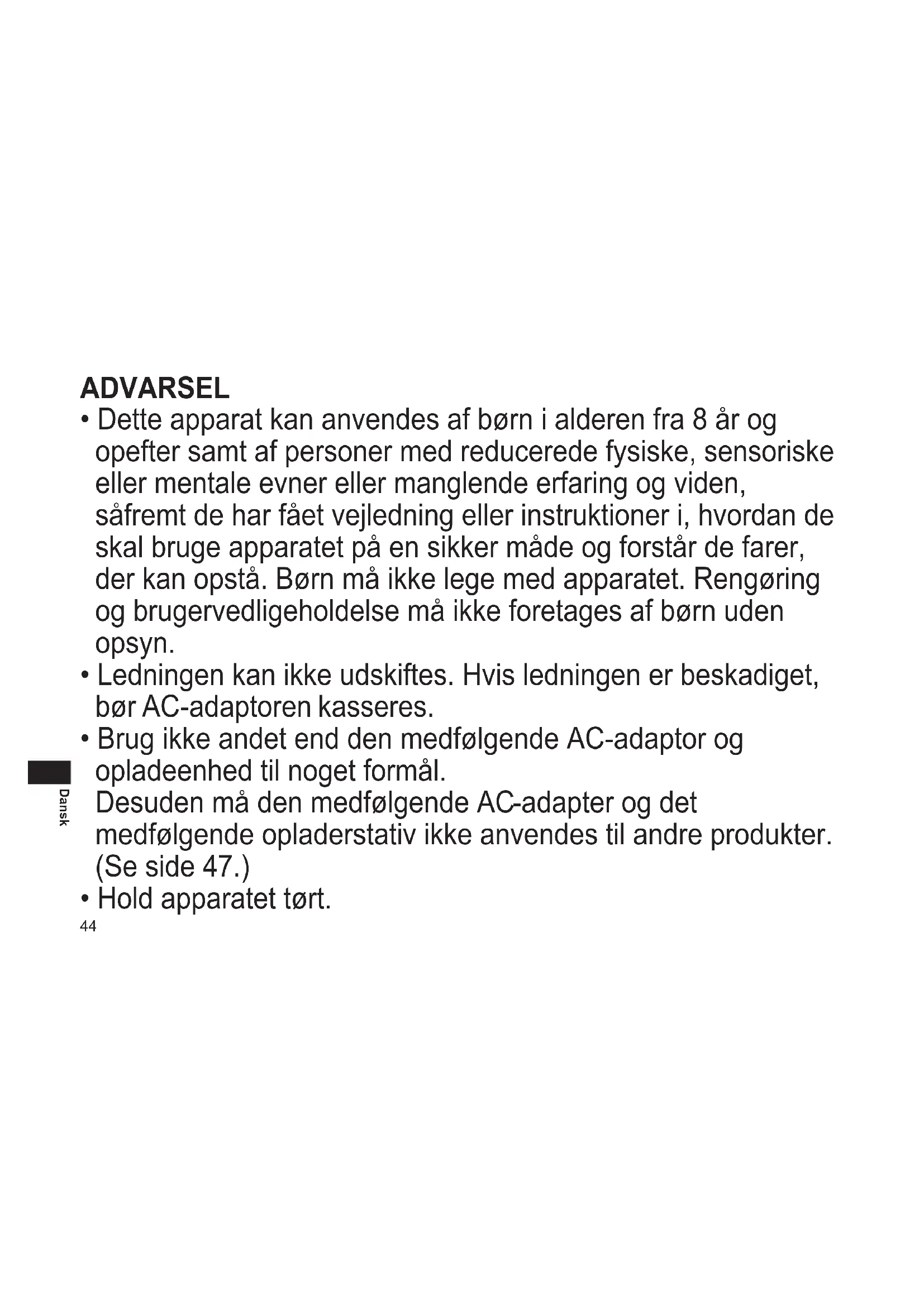 - Dette apparat kan anvendes af børn i alderen fra 8 år og opefter samt af personer med reducerede fysiske, sensoriske eller mentale evner eller manglende erfaring og viden, såfremt de har fået vejledning eller instruktioner i, hvordan de skal bruge apparatet på en sikker måde og forstår de farer, der kan opstå. Børn må ikke lege med apparatet. Rengøring og brugervedligeholdelse må ikke foretages af børn uden opsyn.