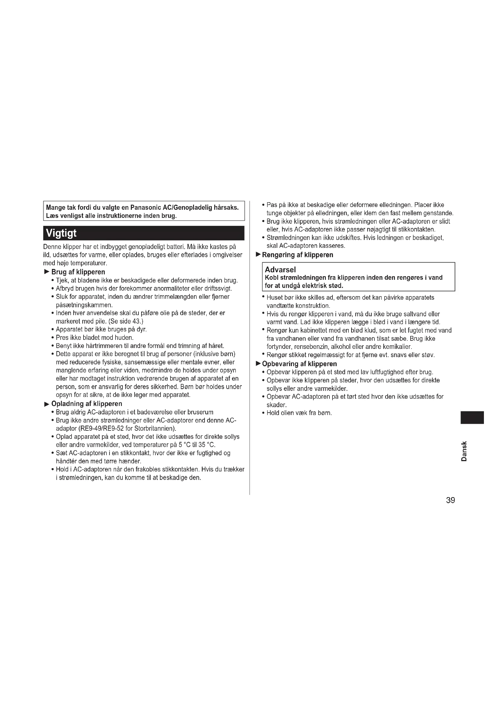 Mange tak fordi du valgte en Panasonic AC/Genopladelig hårsaks. Læs venligst alle instruktionerne inden brug. Vigtigt Denne klipper har et indbygget genopladeligt batteri. Må ikke kastes på ild, udsættes for varme, eller oplades, bruges eller efterlades i omgivelser med høje temperaturer. Brug af klipperen Tjek, at bladene ikke er beskadigede eller deformerede inden brug. Afbryd brugen hvis der forekommer anormaliteter eller driftssvigt. Sluk for apparatet, inden du ændrer trimmelængden eller fjerner påsætningskammen. Inden hver anvendelse skal du påføre olie på de steder, der er markeret med pile. (Se side 43.) Apparatet bør ikke bruges på dyr. Pres ikke bladet mod huden. Benyt ikke hårtrimmeren til andre formål end trimning af håret. Dette apparat er ikke beregnet til brug af personer (inklusive børn) med reducerede fysiske, sansemæssige eller mentale evner, eller manglende erfaring eller viden, medmindre de holdes under opsyn eller har modtaget instruktion vedrørende brugen af apparatet af en person, som er ansvarlig for deres sikkerhed. Børn bør holdes under opsyn for at sikre, at de ikke leger med apparatet. Opladning af klipperen Brug aldrig AC‑adaptoren i et badeværelse eller bruserum Brug ikke andre strømledninger eller AC‑adaptorer end denne AC‑ adaptor (RE9‑49/RE9‑52 for Storbritannien). Oplad apparatet på et sted, hvor det ikke udsættes for direkte sollys eller andre varmekilder, ved temperaturer på 5 °C til 35 °C. Sæt AC‑adaptoren i en stikkontakt, hvor der ikke er fugtighed og håndtér den med tørre hænder. Hold i AC‑adaptoren når den frakobles stikkontakten. Hvis du trækker i strømledningen, kan du komme til at beskadige den.