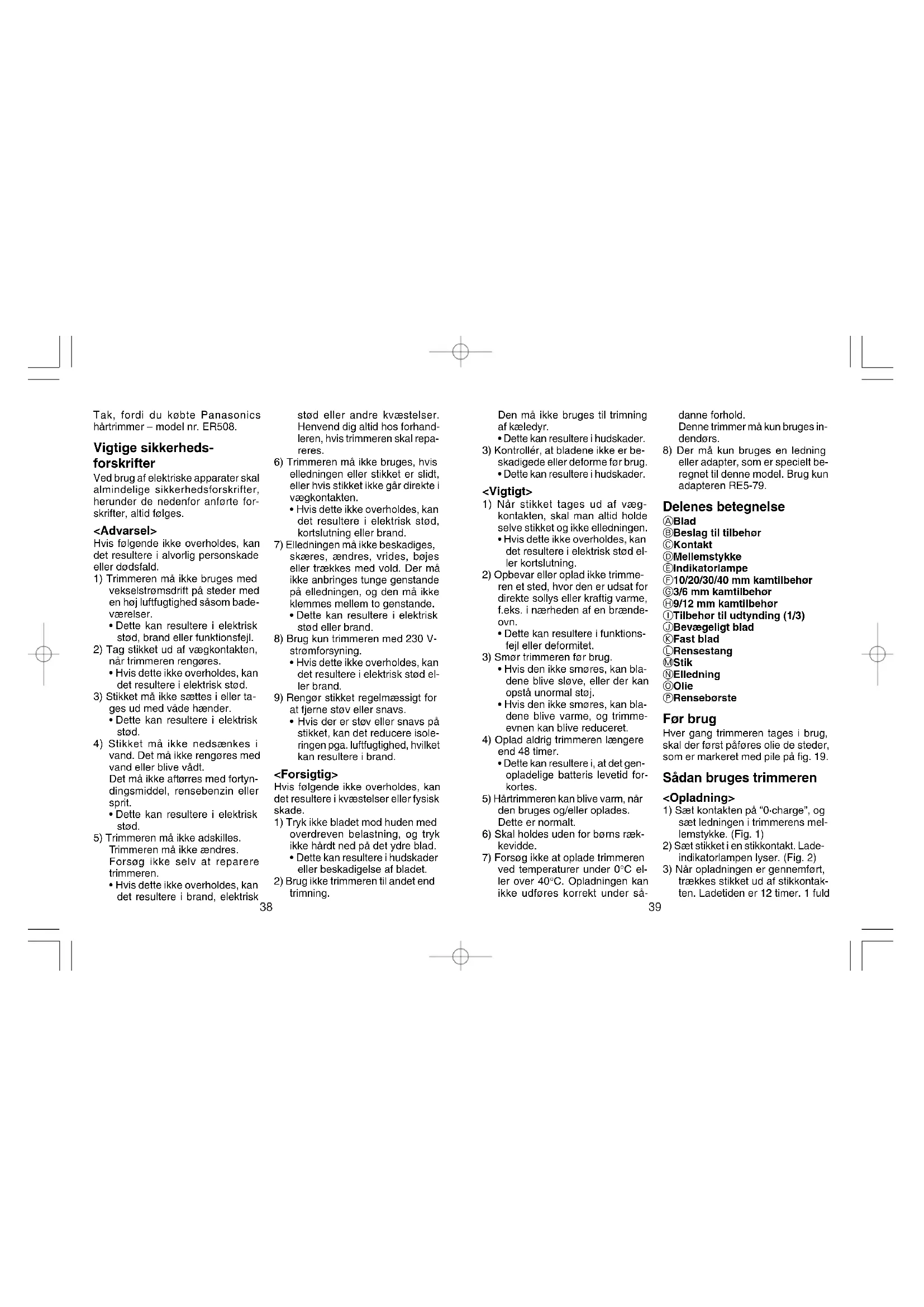 eller adapter, som er specielt be- regnet til denne model. Brug kun adapteren RE5-79. Delenes betegnelse A Blad B Beslag til tilbehør C Kontakt D Mellemstykke E Indikatorlampe F 10/20/30/40 mm kamtilbehør G 3/6 mm kamtilbehør H 9/12 mm kamtilbehør I Tilbehør til udtynding (1/3) J Bevægeligt blad K Fast blad L Rensestang M Stik N Elledning O Olie P Rensebørste Før brug Hver gang trimmeren tages i brug, skal der først påføres olie de steder, som er markeret med pile på fig. 19. Sådan bruges trimmeren <Opladning>