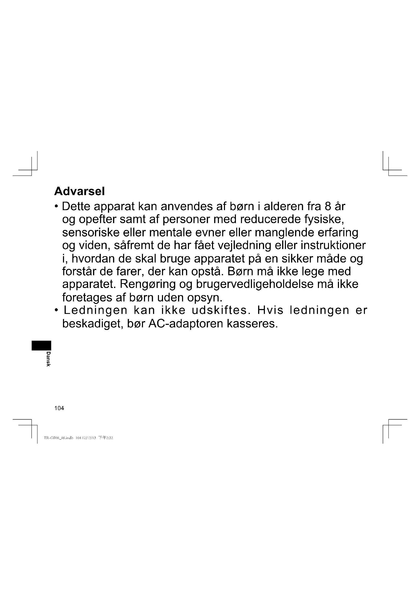 - Ledningen kan ikke udskiftes. Hvis ledningen er beskadiget, bør AC-adaptoren kasseres. ER-GB96_86.indb 104 17/12/13 下午2:32105 Dansk