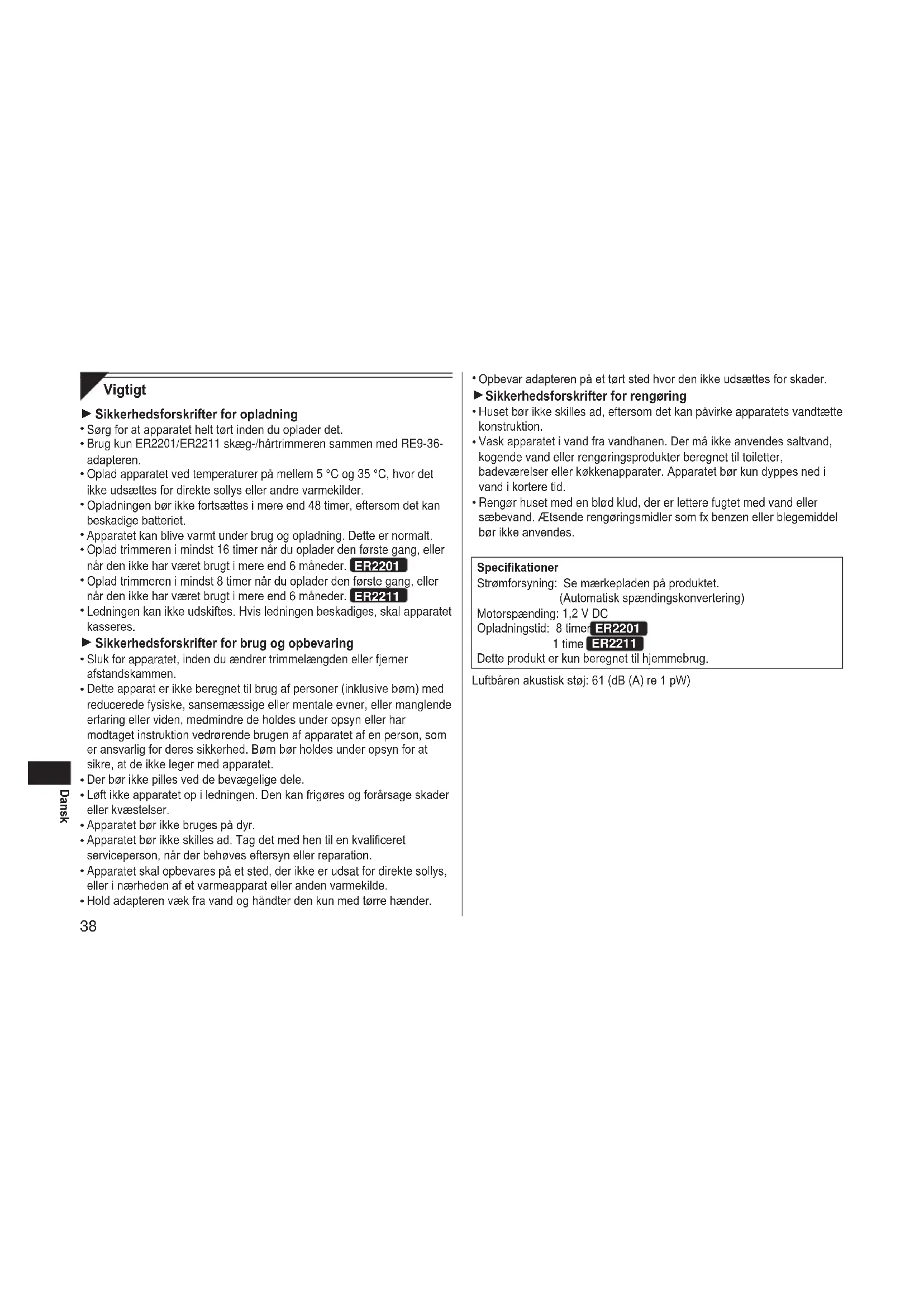 Opbevar adapteren på et tørt sted hvor den ikke udsættes for skader. Sikkerhedsforskrifter for rengøring Huset bør ikke skilles ad, eftersom det kan påvirke apparatets vandtætte konstruktion. Vask apparatet i vand fra vandhanen. Der må ikke anvendes saltvand, kogende vand eller rengøringsprodukter beregnet til toiletter, badeværelser eller køkkenapparater. Apparatet bør kun dyppes ned i vand i kortere tid. Rengør huset med en blød klud, der er lettere fugtet med vand eller sæbevand. Ætsende rengøringsmidler som fx benzen eller blegemiddel bør ikke anvendes. Specikationer Strømforsyning: Se mærkepladen på produktet. (Automatisk spændingskonvertering) Motorspænding: 1,2 V DC Opladningstid: 8 timer ER2201 1 time ER2211 Dette produkt er kun beregnet til hjemmebrug. Luftbåren akustisk støj: 61 (dB (A) re 1 pW)