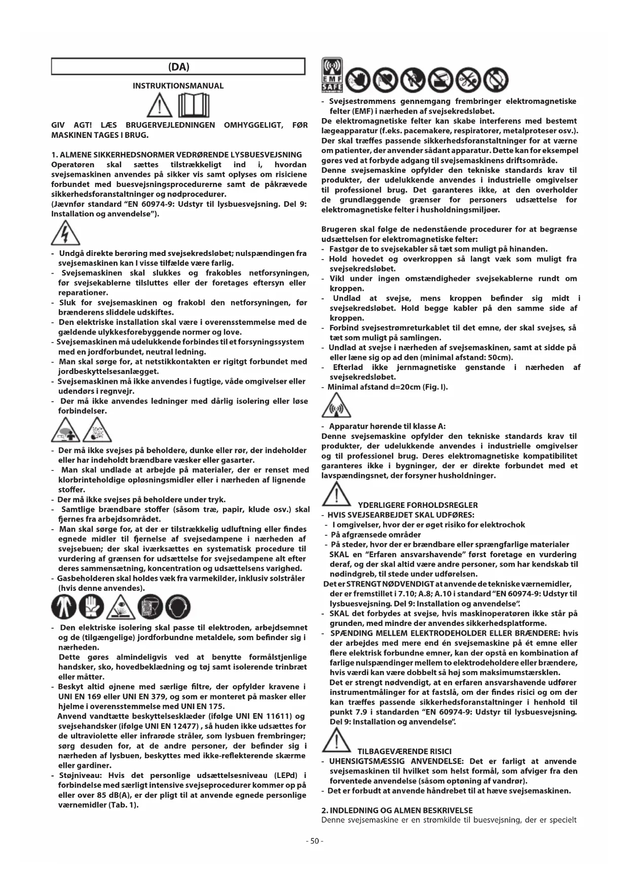 Operatøren skal sættes tilstrækkeligt ind i, hvordan svejsemaskinen anvendes på sikker vis samt oplyses om risiciene forbundet med buesvejsningsprocedurerne samt de påkrævede sikkerhedsforanstaltninger og nødprocedurer. (Jævnfør standard “EN 60974-9: Udstyr til lysbuesvejsning. Del 9: Installation og anvendelse”). - Undgå direkte berøring med svejsekredsløbet; nulspændingen fra svejsemaskinen kan I visse tilfælde være farlig. - Svejsemaskinen skal slukkes og frakobles netforsyningen, før svejsekablerne tilsluttes eller der foretages eftersyn eller reparationer. - Sluk for svejsemaskinen og frakobl den netforsyningen, før brænderens sliddele udskiftes. - Den elektriske installation skal være i overensstemmelse med de gældende ulykkesforebyggende normer og love. - Svejsemaskinen må udelukkende forbindes til et forsyningssystem med en jordforbundet, neutral ledning. - Man skal sørge for, at netstikkontakten er rigitgt forbundet med jordbeskyttelsesanlægget. - Svejsemaskinen må ikke anvendes i fugtige, våde omgivelser eller udendørs i regnvejr. - Der må ikke anvendes ledninger med dårlig isolering eller løse forbindelser. - Der må ikke svejses på beholdere, dunke eller rør, der indeholder eller har indeholdt brændbare væsker eller gasarter. - Man skal undlade at arbejde på materialer, der er renset med klorbrinteholdige opløsningsmidler eller i nærheden af lignende stoer. - Der må ikke svejses på beholdere under tryk. - Samtlige brændbare stoer (såsom træ, papir, klude osv.) skal ernes fra arbejdsområdet. - Man skal sørge for, at der er tilstrækkelig udluftning eller ndes egnede midler til ernelse af svejsedampene i nærheden af svejsebuen; der skal iværksættes en systematisk procedure til vurdering af grænsen for udsættelse for svejsedampene alt efter deres sammensætning, koncentration og udsættelsens varighed. - Gasbeholderen skal holdes væk fra varmekilder, inklusiv solstråler (hvis denne anvendes). - Den elektriske isolering skal passe til elektroden, arbejdsemnet og de (tilgængelige) jordforbundne metaldele, som bender sig i nærheden. Dette gøres almindeligvis ved at benytte formålstjenlige handsker, sko, hovedbeklædning og tøj samt isolerende trinbræt eller måtter. - Beskyt altid øjnene med særlige ltre, der opfylder kravene i UNI EN 169 eller UNI EN 379, og som er monteret på masker eller hjelme i overensstemmelse med UNI EN 175. Anvend vandtætte beskyttelsesklæder (ifølge UNI EN 11611) og svejsehandsker (ifølge UNI EN 12477) , så huden ikke udsættes for de ultraviolette eller infrarøde stråler, som lysbuen frembringer; sørg desuden for, at de andre personer, der bender sig i nærheden af lysbuen, beskyttes med ikke-reekterende skærme eller gardiner. - Støjniveau: Hvis det personlige udsættelsesniveau (LEPd) i forbindelse med særligt intensive svejseprocedurer kommer op på eller over 85 dB(A), er der pligt til at anvende egnede personlige værnemidler (Tab. 1). - Svejsestrømmens gennemgang frembringer elektromagnetiske felter (EMF) i nærheden af svejsekredsløbet. De elektromagnetiske felter kan skabe interferens med bestemt lægeapparatur (f.eks. pacemakere, respiratorer, metalproteser osv.). Der skal træes passende sikkerhedsforanstaltninger for at værne om patienter, der anvender sådant apparatur. Dette kan for eksempel gøres ved at forbyde adgang til svejsemaskinens driftsområde. Denne svejsemaskine opfylder den tekniske standards krav til produkter, der udelukkende anvendes i industrielle omgivelser til professionel brug. Det garanteres ikke, at den overholder de grundlæggende grænser for personers udsættelse for elektromagnetiske felter i husholdningsmiljøer. Brugeren skal følge de nedenstående procedurer for at begrænse udsættelsen for elektromagnetiske felter: - Fastgør de to svejsekabler så tæt som muligt på hinanden. - Hold hovedet og overkroppen så langt væk som muligt fra svejsekredsløbet. - Vikl under ingen omstændigheder svejsekablerne rundt om kroppen. - Undlad at svejse, mens kroppen bender sig midt i svejsekredsløbet. Hold begge kabler på den samme side af kroppen. - Forbind svejsestrømreturkablet til det emne, der skal svejses, så tæt som muligt på samlingen. - Undlad at svejse i nærheden af svejsemaskinen, samt at sidde på eller læne sig op ad den (minimal afstand: 50cm). - Efterlad ikke jernmagnetiske genstande i nærheden af svejsekredsløbet. - Minimal afstand d=20cm (Fig. I). - Apparatur hørende til klasse A: Denne svejsemaskine opfylder den tekniske standards krav til produkter, der udelukkende anvendes i industrielle omgivelser og til professionel brug. Deres elektromagnetiske kompatibilitet garanteres ikke i bygninger, der er direkte forbundet med et lavspændingsnet, der forsyner husholdninger. YDERLIGERE FORHOLDSREGLER - HVIS SVEJSEARBEJDET SKAL UDFØRES: - I omgivelser, hvor der er øget risiko for elektrochok - På afgrænsede områder - På steder, hvor der er brændbare eller sprængfarlige materialer SKAL en “Erfaren ansvarshavende” først foretage en vurdering deraf, og der skal altid være andre personer, som har kendskab til nødindgreb, til stede under udførelsen. Det er STRENGT NØDVENDIGT at anvende de tekniske værnemidler, der er fremstillet i 7.10; A.8; A.10 i standard “EN 60974-9: Udstyr til lysbuesvejsning. Del 9: Installation og anvendelse”. - SKAL det forbydes at svejse, hvis maskinoperatøren ikke står på grunden, med mindre der anvendes sikkerhedsplatforme. - SPÆNDING MELLEM ELEKTRODEHOLDER ELLER BRÆNDERE: hvis der arbejdes med mere end én svejsemaskine på ét emne eller ere elektrisk forbundne emner, kan der opstå en kombination af farlige nulspændinger mellem to elektrodeholdere eller brændere, hvis værdi kan være dobbelt så høj som maksimumstærsklen. Det er strengt nødvendigt, at en erfaren ansvarshavende udfører instrumentmålinger for at fastslå, om der ndes risici og om der kan træes passende