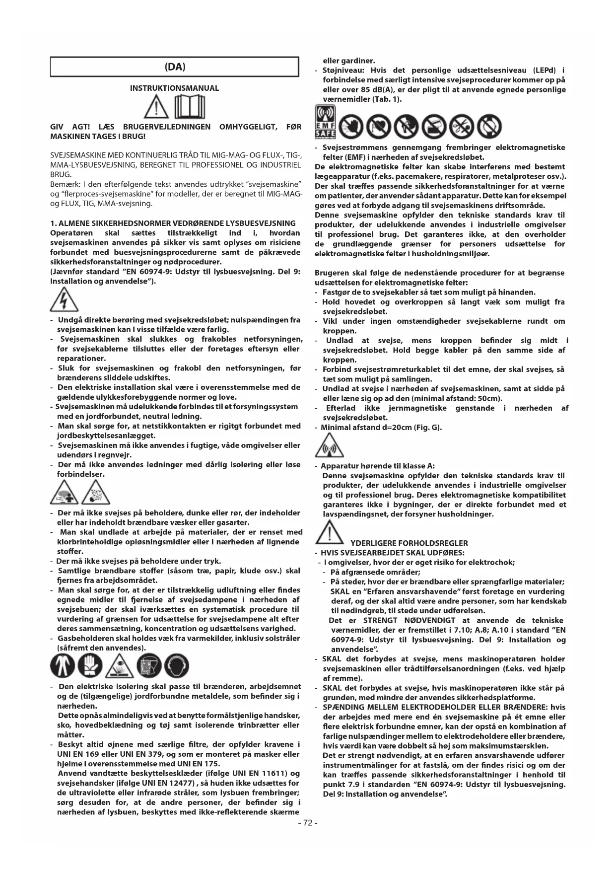 Operatøren skal sættes tilstrækkeligt ind i, hvordan svejsemaskinen anvendes på sikker vis samt oplyses om risiciene forbundet med buesvejsningsprocedurerne samt de påkrævede sikkerhedsforanstaltninger og nødprocedurer. (Jævnfør standard ”EN 60974-9: Udstyr til lysbuesvejsning. Del 9: Installation og anvendelse”). - Undgå direkte berøring med svejsekredsløbet; nulspændingen fra svejsemaskinen kan I visse tilfælde være farlig. - Svejsemaskinen skal slukkes og frakobles netforsyningen, før svejsekablerne tilsluttes eller der foretages eftersyn eller reparationer. - Sluk for svejsemaskinen og frakobl den netforsyningen, før brænderens sliddele udskiftes. - Den elektriske installation skal være i overensstemmelse med de gældende ulykkesforebyggende normer og love. - Svejsemaskinen må udelukkende forbindes til et forsyningssystem med en jordforbundet, neutral ledning. - Man skal sørge for, at netstikkontakten er rigitgt forbundet med jordbeskyttelsesanlægget. - Svejsemaskinen må ikke anvendes i fugtige, våde omgivelser eller udendørs i regnvejr. - Der må ikke anvendes ledninger med dårlig isolering eller løse forbindelser. - Der må ikke svejses på beholdere, dunke eller rør, der indeholder eller har indeholdt brændbare væsker eller gasarter. - Man skal undlade at arbejde på materialer, der er renset med klorbrinteholdige opløsningsmidler eller i nærheden af lignende stoer. - Der må ikke svejses på beholdere under tryk. - Samtlige brændbare stoer (såsom træ, papir, klude osv.) skal ernes fra arbejdsområdet. - Man skal sørge for, at der er tilstrækkelig udluftning eller ndes egnede midler til ernelse af svejsedampene i nærheden af svejsebuen; der skal iværksættes en systematisk procedure til vurdering af grænsen for udsættelse for svejsedampene alt efter deres sammensætning, koncentration og udsættelsens varighed. - Gasbeholderen skal holdes væk fra varmekilder, inklusiv solstråler (såfremt den anvendes). - Den elektriske isolering skal passe til brænderen, arbejdsemnet og de (tilgængelige) jordforbundne metaldele, som bender sig i nærheden. Dette opnås almindeligvis ved at benytte formålstjenlige handsker, sko, hovedbeklædning og tøj samt isolerende trinbrætter eller måtter. - Beskyt altid øjnene med særlige ltre, der opfylder kravene i UNI EN 169 eller UNI EN 379, og som er monteret på masker eller hjelme i overensstemmelse med UNI EN 175. Anvend vandtætte beskyttelsesklæder (ifølge UNI EN 11611) og svejsehandsker (ifølge UNI EN 12477) , så huden ikke udsættes for de ultraviolette eller infrarøde stråler, som lysbuen frembringer; sørg desuden for, at de andre personer, der bender sig i nærheden af lysbuen, beskyttes med ikke-reekterende skærme eller gardiner. - Støjniveau: Hvis det personlige udsættelsesniveau (LEPd) i forbindelse med særligt intensive svejseprocedurer kommer op på eller over 85 dB(A), er der pligt til at anvende egnede personlige værnemidler (Tab. 1). - Svejsestrømmens gennemgang frembringer elektromagnetiske felter (EMF) i nærheden af svejsekredsløbet. De elektromagnetiske felter kan skabe interferens med bestemt lægeapparatur (f.eks. pacemakere, respiratorer, metalproteser osv.). Der skal træes passende sikkerhedsforanstaltninger for at værne om patienter, der anvender sådant apparatur. Dette kan for eksempel gøres ved at forbyde adgang til svejsemaskinens driftsområde. Denne svejsemaskine opfylder den tekniske standards krav til produkter, der udelukkende anvendes i industrielle omgivelser til professionel brug. Det garanteres ikke, at den overholder de grundlæggende grænser for personers udsættelse for elektromagnetiske felter i husholdningsmiljøer. Brugeren skal følge de nedenstående procedurer for at begrænse udsættelsen for elektromagnetiske felter: - Fastgør de to svejsekabler så tæt som muligt på hinanden. - Hold hovedet og overkroppen så langt væk som muligt fra svejsekredsløbet. - Vikl under ingen omstændigheder svejsekablerne rundt om kroppen. - Undlad at svejse, mens kroppen bender sig midt i svejsekredsløbet. Hold begge kabler på den samme side af kroppen. - Forbind svejsestrømreturkablet til det emne, der skal svejses, så tæt som muligt på samlingen. - Undlad at svejse i nærheden af svejsemaskinen, samt at sidde på eller læne sig op ad den (minimal afstand: 50cm). - Efterlad ikke jernmagnetiske genstande i nærheden af svejsekredsløbet. - Minimal afstand d=20cm (Fig. G). - Apparatur hørende til klasse A: Denne svejsemaskine opfylder den tekniske standards krav til produkter, der udelukkende anvendes i industrielle omgivelser og til professionel brug. Deres elektromagnetiske kompatibilitet garanteres ikke i bygninger, der er direkte forbundet med et lavspændingsnet, der forsyner husholdninger. YDERLIGERE FORHOLDSREGLER - HVIS SVEJSEARBEJDET SKAL UDFØRES: - I omgivelser, hvor der er øget risiko for elektrochok; - På afgrænsede områder; - På steder, hvor der er brændbare eller sprængfarlige materialer; SKAL en “Erfaren ansvarshavende” først foretage en vurdering deraf, og der skal altid være andre personer, som har kendskab til nødindgreb, til stede under udførelsen. Det er STRENGT NØDVENDIGT at anvende de tekniske værnemidler, der er fremstillet i 7.10; A.8; A.10 i standard ”EN 60974-9: Udstyr til lysbuesvejsning. Del 9: Installation og anvendelse”. - SKAL det forbydes at svejse, mens maskinoperatøren holder svejsemaskinen eller trådtilførselsanordningen (f.eks. ved hjælp af remme). - SKAL det forbydes at svejse, hvis maskinoperatøren ikke står på grunden, med mindre der anvendes sikkerhedsplatforme. - SPÆNDING MELLEM ELEKTRODEHOLDER ELLER BRÆNDERE: hvis der arbejdes med mere end én svejsemaskine på ét emne eller ere elektrisk forbundne emner, kan der opstå en kombination af farlige nulspændinger mellem to elektrodeholdere eller brændere, hvis værdi kan være dobbelt så høj som maksimumstærsklen. Det