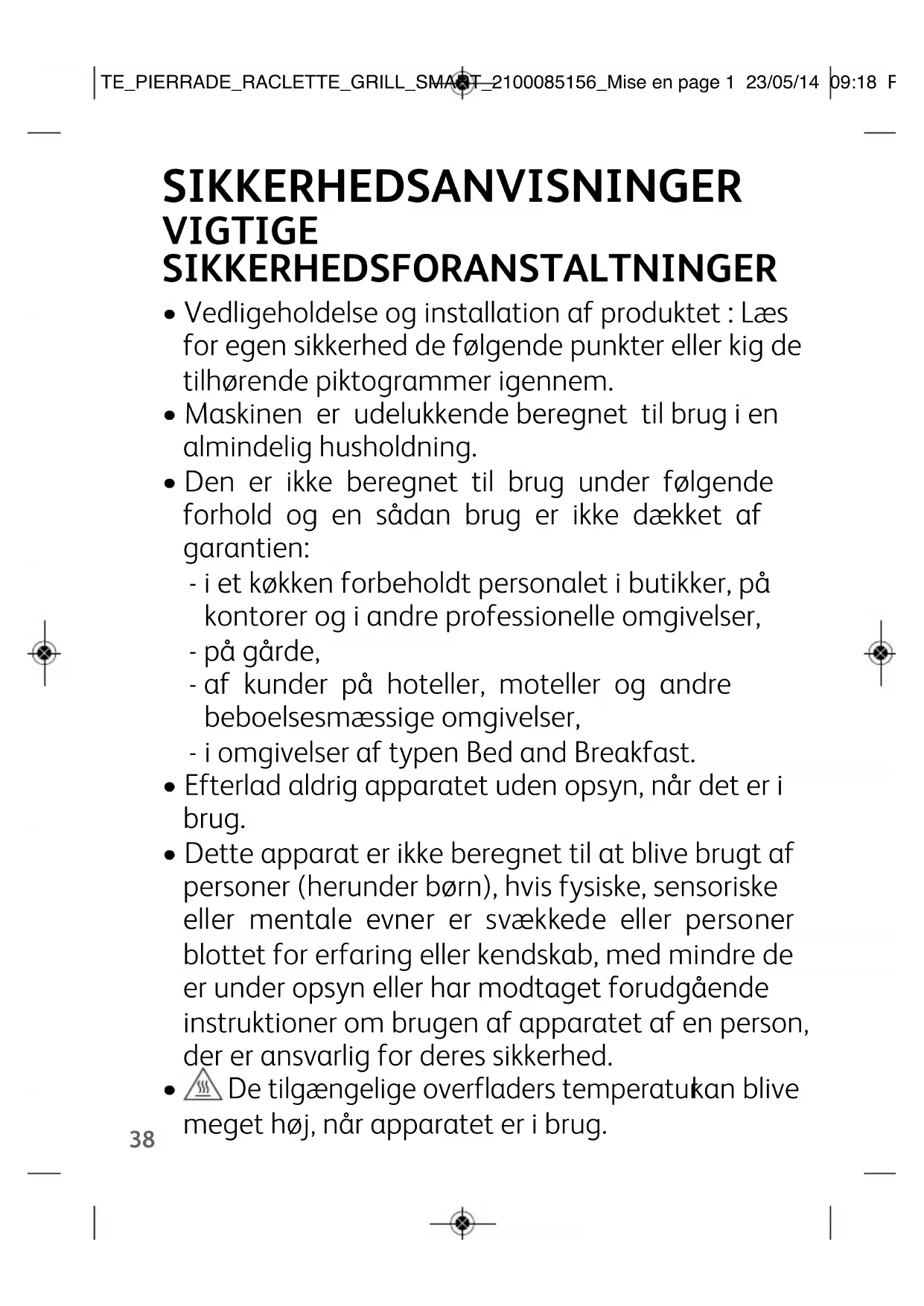 TE_PIERRADE_RACLETTE_GRILL_SMART_2100085156_Mise en page 1 23/05/14 09:18 Page38• Fjern al emballage, alle selvklæbende mærkater og alt tilbehør både indvendigt og udvendigt i/på apparatet.