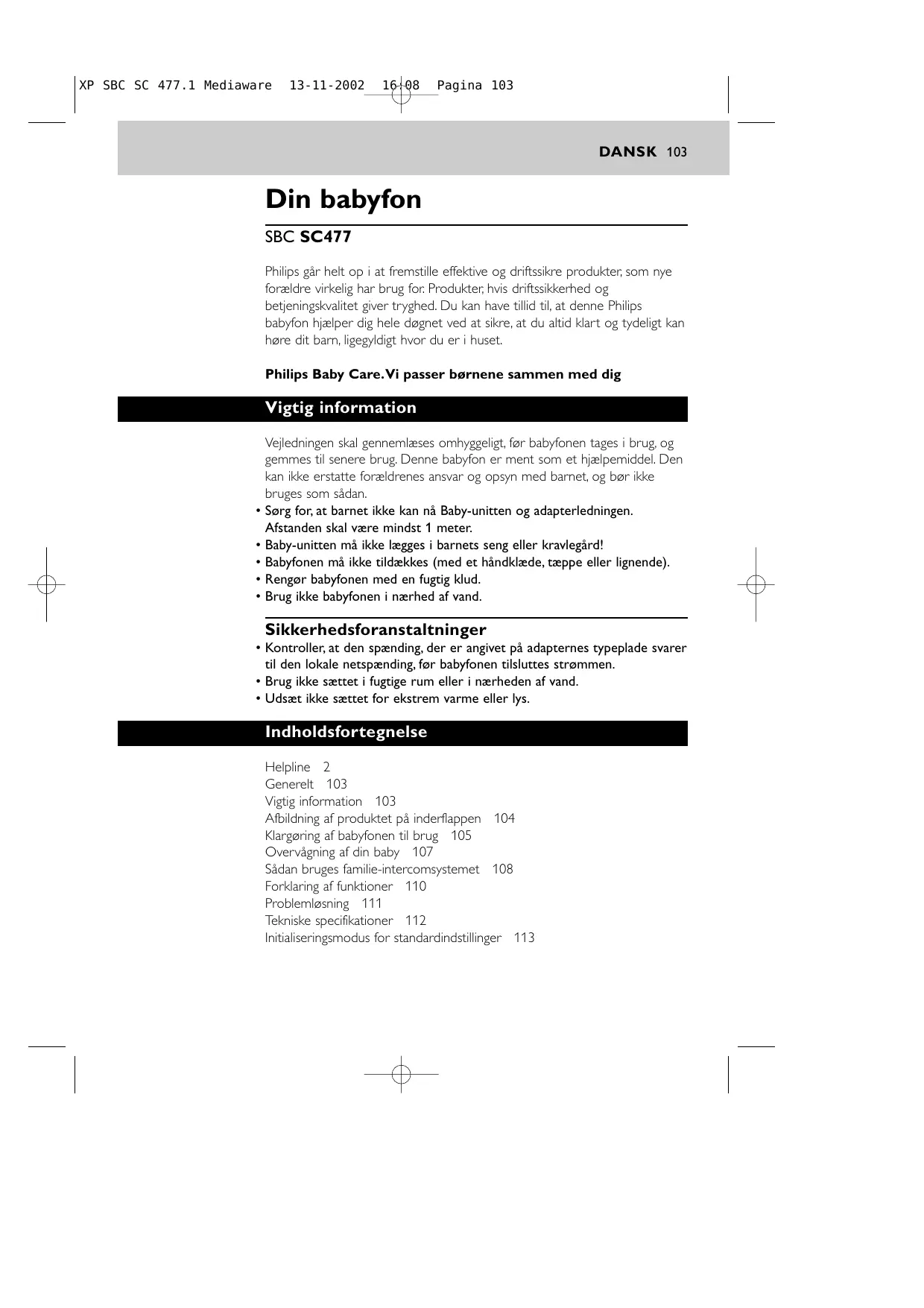 - Udsæt ikke sættet for ekstrem varme eller lys. Indholdsfortegnelse Helpline 2 Generelt 103 Vigtig information 103 Afbildning af produktet på inderflappen 104 Klargøring af babyfonen til brug 105 Overvågning af din baby 107 Sådan bruges familie-intercomsystemet 108 Forklaring af funktioner 110 Problemløsning 111 Tekniske specifikationer 112 Initialiseringsmodus for standardindstillinger 113 XP SBC SC 477.1 Mediaware