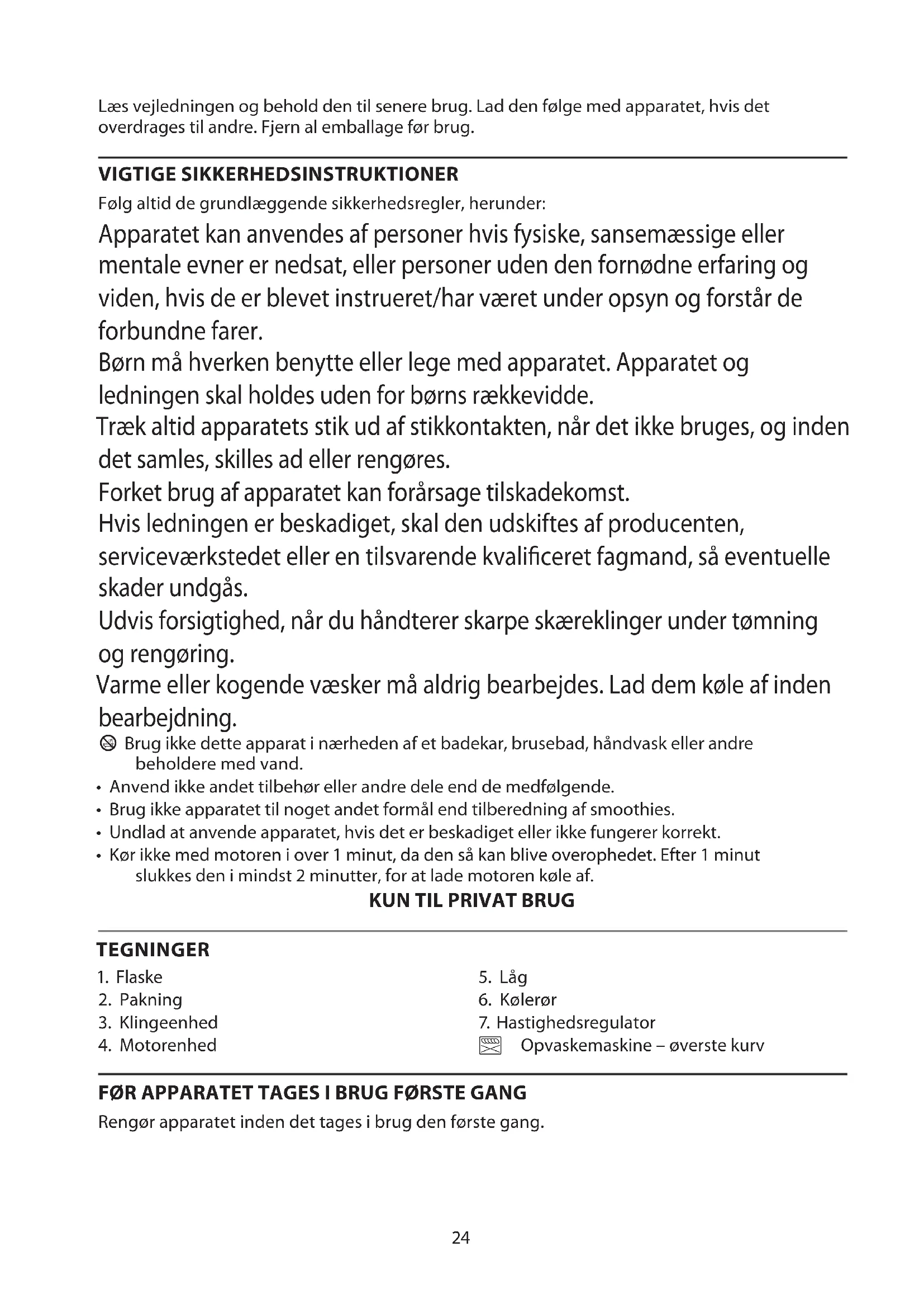 Processe tudo até obter uma consistência suave.24 Læs vejledningen og behold den til senere brug. Lad den følge med apparatet, hvis det overdrages til andre. Fjern al emballage før brug. VIGTIGE SIKKERHEDSINSTRUKTIONER Følg altid de grundlæggende sikkerhedsregler, herunder: Apparatet kan anvendes af personer hvis fysiske, sansemæssige eller mentale evner er nedsat, eller personer uden den fornødne erfaring og viden, hvis de er blevet instrueret/har været under opsyn og forstår de forbundne farer. Børn må hverken benytte eller lege med apparatet. Apparatet og ledningen skal holdes uden for børns rækkevidde. Træk altid apparatets stik ud af stikkontakten, når det ikke bruges, og inden det samles, skilles ad eller rengøres. Forket brug af apparatet kan forårsage tilskadekomst. Hvis ledningen er beskadiget, skal den udskiftes af producenten, serviceværkstedet eller en tilsvarende kvaliceret fagmand, så eventuelle skader undgås. Udvis forsigtighed, når du håndterer skarpe skæreklinger under tømning og rengøring. Varme eller kogende væsker må aldrig bearbejdes. Lad dem køle af inden bearbejdning. b Brug ikke dette apparat i nærheden af et badekar, brusebad, håndvask eller andre beholdere med vand.