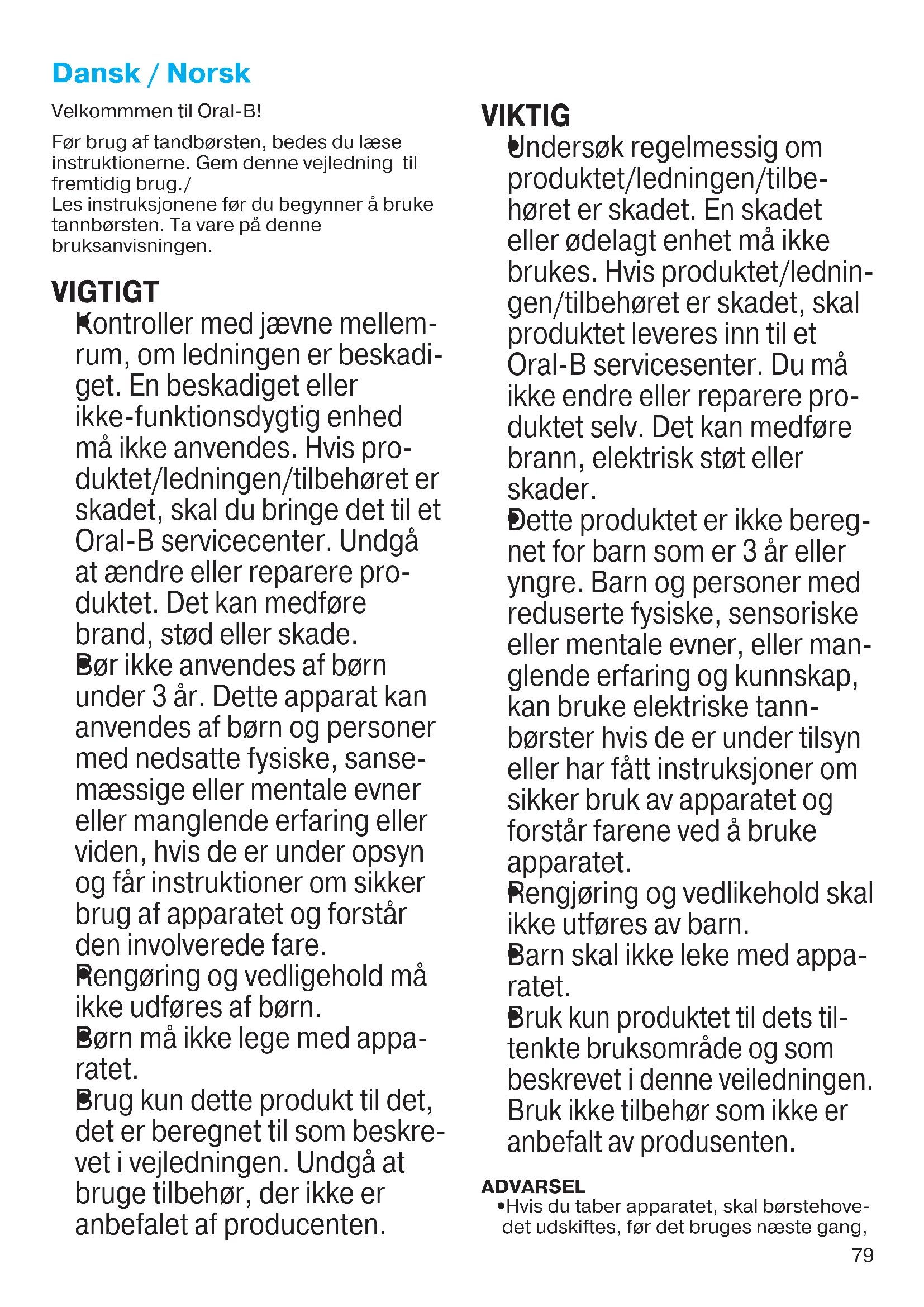 Detteprodukter er ikke beregnet for barn som er 3år elleryngre. Barn og personer med reduserte fysisiske, sensoriske eller mentale evner, eller manglende erfaring og kunnskap, kan bruke elektriske tannbørster,hvis de er under tilsyn uller har fätt instruksjoner om sikker bruk av apparatet ogforallfarene ved a bruke apparatet.