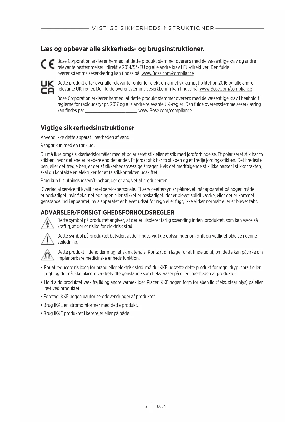 Dette produit afterlever alle relevante regler for elektromagnetisk kompatilitet pr. 2016 og alle andre relevante UK-regler. Den fulde overensstemmelseserklaering kan findes pa: www.Bose.com/compliance