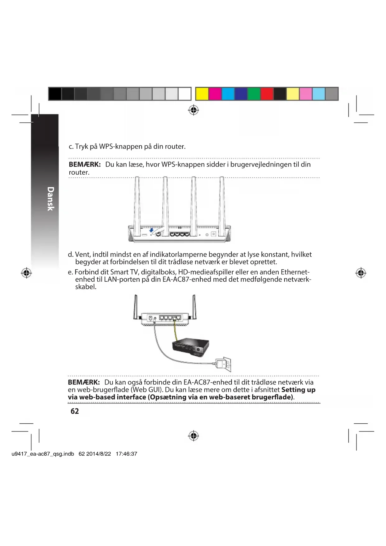 BEMÆRK: Du kan læse, hvor WPS-knappen sidder i brugervejledningen til din router. c. Tryk på WPS-knappen på din router. d. Vent, indtil mindst en af indikatorlamperne begynder at lyse konstant, hvilket begyder at forbindelsen til dit trådløse netværk er blevet oprettet. e. Forbind dit Smart TV, digitalboks, HD-medieafspiller eller en anden Ethernet- enhed til LAN-porten på din EA-AC87-enhed med det medfølgende netværk- skabel. BEMÆRK: Du kan også forbinde din EA-AC87-enhed til dit trådløse netværk via en web-brugerade (Web GUI). Du kan læse mere om dette i afsnittet Setting up via web-based interface (Opsætning via en web-baseret brugerade). u9417_ea-ac87_qsg.indb 62 2014/8/22 17:46:37Dansk