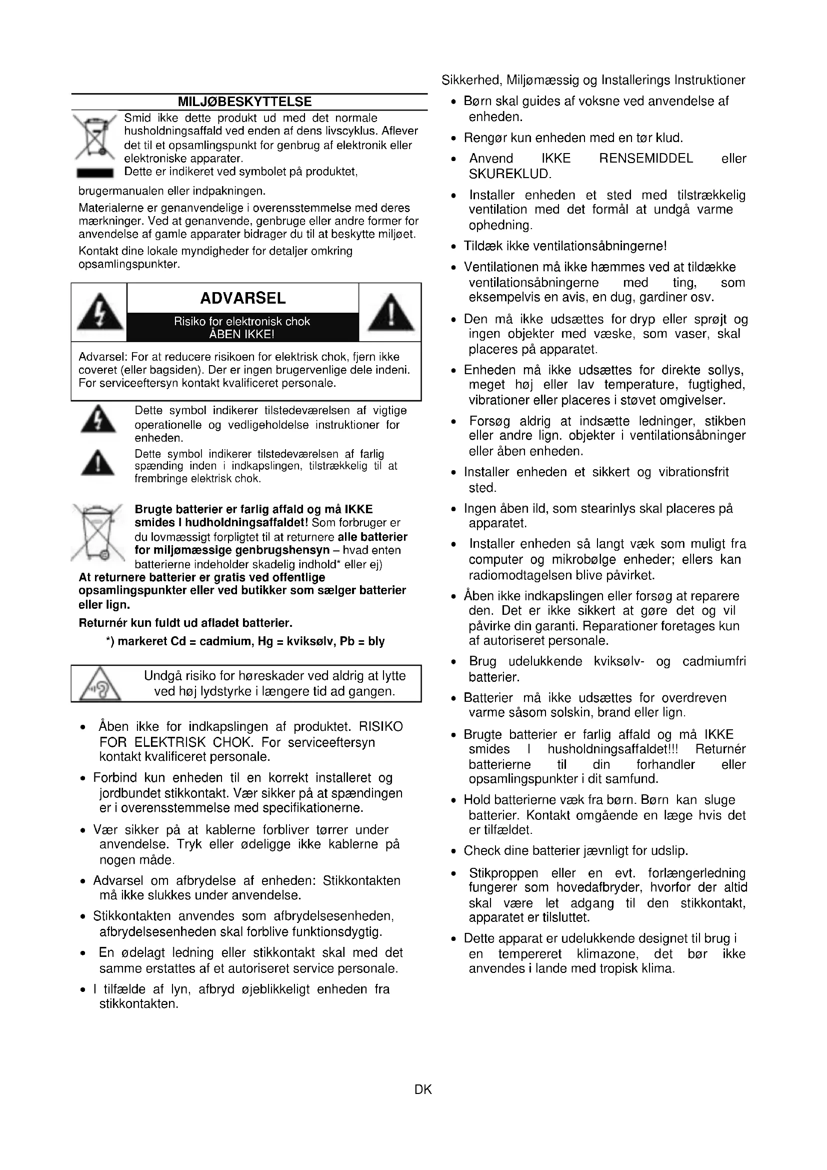 Brugte batterier er farlig affald og må IKKE smides I hudholdningsaffaldet! Som forbruger er du lovmæssigt forpligtet til at returnere alle batterier for miljømæssige genbrugshensyn – hvad enten batterierne indeholder skadelig indhold* eller ej)