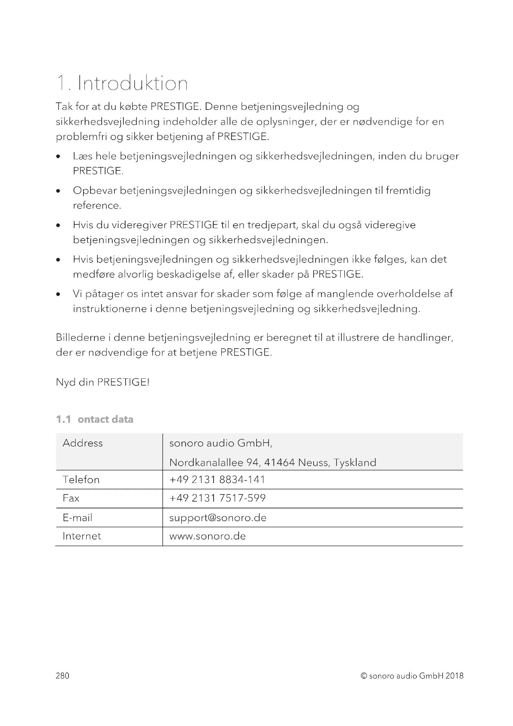 © sonoro audio GmbH 2018 2791. Introduktion Tak for at du købte PRESTIGE. Denne betjeningsvejledning og sikkerhedsvejledning indeholder alle de oplysninger, der er nødvendige for en problemfri og sikker betjening af PRESTIGE.