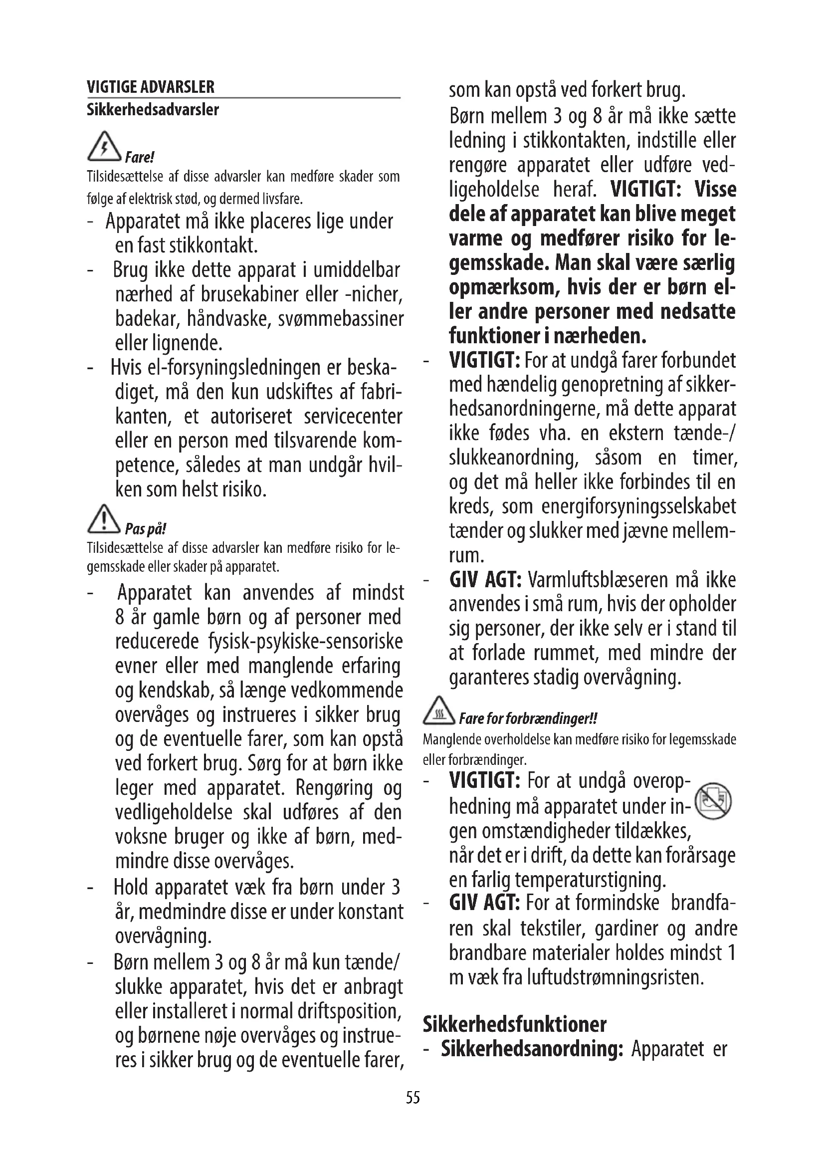 RÄCKHÅLL FÖR BARN. - Förtäring kan orsaka allvarlig ska- da på mindre än 2 timmar eller kan leda till döden, på grund av kemiska brännskador och eventuell perfore- ring av matstrupen. - Kontrollera anordningarna och säker- ställ att batterifacket är riktigt stängt. Ska inte användas om batterifacket inte är säkert. - Skaa bort gamla knappbatterier omedelbart och på säkert sätt. Ur- laddade batterier kan fortfarande vara farliga. Grundläggande säkerhetsföreskrifter Bäste kund - under funktionen kan apparatens kontakt bli varm vilket är absolut normalt. Detta är en HÖ GEFFEKTS VÄRMEANORDNING som överensstämmer med högsta gällande standarder. Vi rekommenderar emellertid att du kontrollerar att vägguttagen är i gott skick och att kontakten sitter riktigt i vägguttaget för54 att undvika oavsiktlig överhettning. Om apparaten används under långa tidsperioder rekommenderas det att du regelbundet kontrollerar stickkontakten OCH VÄGGUTTAGET och kontakta en elektriker vid tvekan. Endast för länder utanför EU: Denna apparat är inte avsedd att använ- das av personer (inklusive barn) med nedsatt fysisk, sensorisk eller mental förmåga, eller brist på erfarenhet och kunskap, såvida de inte hålls under upp- sikt eller har fått instruktioner om an- vändningen av apparaten av en person som ansvarar för deras säkerhet. Barn bör övervakas för att säkerställa att de inte kan leka med apparaten. Avfallshantering Ska apparaten inte kastas bland hushållssoporna, utan lämnas till en återvinningscentral.55 VIGTIGE ADVARSLER Sikkerhedsadvarsler Fare! Tilsidesættelse af disse advarsler kan medføre skader som følge af elektrisk stød, og dermed livsfare. - Apparatet må ikke placeres lige under en fast stikkontakt. - Brug ikke dette apparat i umiddelbar nærhed af brusekabiner eller -nicher, badekar, håndvaske, svømmebassiner eller lignende. - Hvis el-forsyningsledningen er beska- diget, må den kun udskiftes af fabri- kanten, et autoriseret servicecenter eller en person med tilsvarende kom- petence, således at man undgår hvil- ken som helst risiko. Pas på! Tilsidesættelse af disse advarsler kan medføre risiko for le- gemsskade eller skader på apparatet. - Apparatet kan anvendes af mindst 8 år gamle børn og af personer med reducerede fysisk-psykiske-sensoriske evner eller med manglende erfaring og kendskab, så længe vedkommende overvåges og instrueres i sikker brug og de eventuelle farer, som kan opstå ved forkert brug. Sørg for at børn ikke leger med apparatet. Rengøring og vedligeholdelse skal udføres af den voksne bruger og ikke af børn, med- mindre disse overvåges. - Hold apparatet væk fra børn under 3 år, medmindre disse er under konstant overvågning. - Børn mellem 3 og 8 år må kun tænde/ slukke apparatet, hvis det er anbragt eller installeret i normal driftsposition, og børnene nøje overvåges og instrue- res i sikker brug og de eventuelle farer, som kan opstå ved forkert brug. Børn mellem 3 og 8 år må ikke sætte ledning i stikkontakten, indstille eller rengøre apparatet eller udføre ved- ligeholdelse heraf. VIGTIGT: Visse dele af apparatet kan blive meget varme og medfører risiko for le- gemsskade. Man skal være særlig opmærksom, hvis der er børn el- ler andre personer med nedsatte funktioner i nærheden. - VIGTIGT: For at undgå farer forbundet med hændelig genopretning af sikker- hedsanordningerne, må dette apparat ikke fødes vha. en ekstern tænde-/ slukkeanordning, såsom en timer, og det må heller ikke forbindes til en kreds, som energiforsyningsselskabet tænder og slukker med jævne mellem- rum. - GIV AGT: Varmluftsblæseren må ikke anvendes i små rum, hvis der opholder sig personer, der ikke selv er i stand til at forlade rummet, med mindre der garanteres stadig overvågning. Fare for forbrændinger!! Manglende overholdelse kan medføre risiko for legemsskade eller forbrændinger. - VIGTIGT: For at undgå overop- hedning må apparatet under in- gen omstændigheder tildækkes, når det er i drift, da dette kan forårsage en farlig temperaturstigning. - GIV AGT: For at formindske brandfa- ren skal tekstiler, gardiner og andre brandbare materialer holdes mindst 1 m væk fra luftudstrømningsristen. Sikkerhedsfunktioner - Sikkerhedsanordning: Apparatet er56 forsynet med en sikkerhedsanordning, der afbryder varmeblæserens drift i til- fælde af hændelig overophedning (på grund af f.eks. tilstopning af indsug- nings- eller udblæsningsristene, moto- ren ikke kører eller kører for langsomt). For at sætte apparatet i drift igen, skal du tage stikket ud af stikkontakten og lade apparatet køle af i et par minutter. Fjern årsagen til overophedningen, og sæt derefter stikket i stikkontakten igen. Kontakt den nærmeste De’Longhi kun- decenter, hvis apparatet fortsat ikke virker. - Væltesikring: Nogle modeller er for- synet med en antikip-anordning, der slukker apparatet, hvis det vælter. For at tænde for apparatet igen, er det til- strækkeligt at rejse det op igen. Bemærk: Dette symbol fremhæver anbefalinger eller vigtige oplysnin- ger til brugeren. - Anvend apparatet på en vandret, stabil ade. - Brug altid kun apparatet i opretståen- de stilling. - Undlad at anvende apparatet, hvis det er væltet. - Undlad at anvende apparatet, hvis der er synlige tegn på skader på det. - Det frarådes at bruge forlængerlednin- ger. Hvis det skulle blive nødvendigt at bruge dem, skal man nøje følge anvis- ningerne der følger med forlængerled- ningen, og passe på ikke at overskride den eektgrænse, der er angivet på forlængerledningen. - Lad ikke apparatet køre, når det står op ad vægge, møbler, gardiner eller lignende. - Brug ikke dette apparatet i et rum, hvis grundareal er mindre end 4m². - Før apparatet stilles bort, skal man kontrollere, om det er slukket og om stikket er trukket ud af stikkontakten. Må ikke stilles i støvede omgivelser. - Der må ikke sættes noget oven på ap