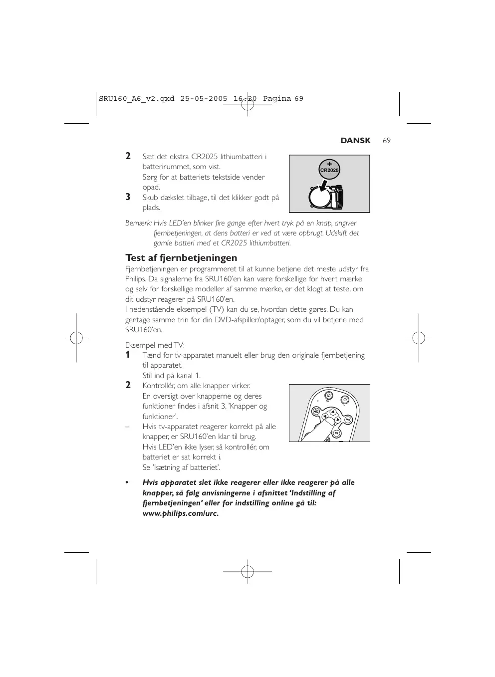 - Hvis tv-apparatet reagerer korrekt på alle knapper; er SRU160'en klartilbrug. Hvis LED'en ikke lyser, sä kontrotler; om batteriet er sat korrekt i. Se 'Isætning af batteriet'.