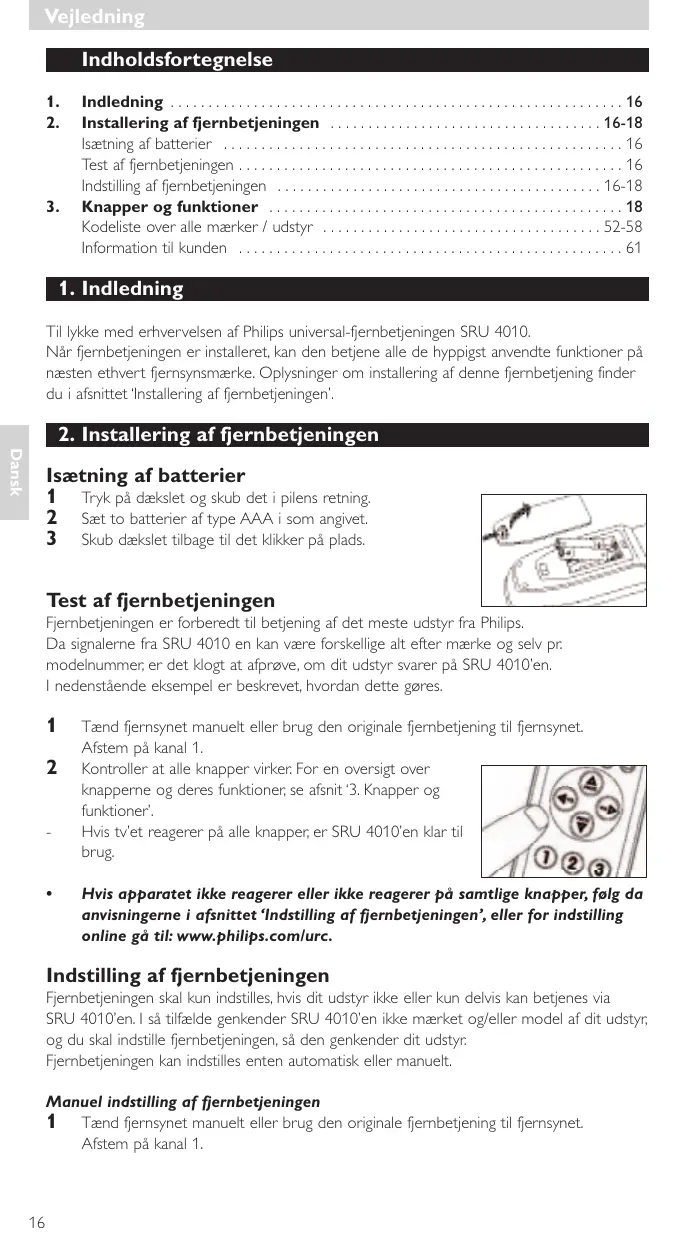 Indledning . . . . . . . . . . . . . . . . . . . . . . . . . . . . . . . . . . . . . . . . . . . . . . . . . . . . . . . . . . . . 16 Installering af fjernbetjeningen . . . . . . . . . . . . . . . . . . . . . . . . . . . . . . . . . . . . 16-18 Isætning af batterier . . . . . . . . . . . . . . . . . . . . . . . . . . . . . . . . . . . . . . . . . . . . . . . . . . . . . 16 Test af fjernbetjeningen . . . . . . . . . . . . . . . . . . . . . . . . . . . . . . . . . . . . . . . . . . . . . . . . . . . 16 Indstilling af fjernbetjeningen . . . . . . . . . . . . . . . . . . . . . . . . . . . . . . . . . . . . . . . . . . . 16-18 Knapper og funktioner . . . . . . . . . . . . . . . . . . . . . . . . . . . . . . . . . . . . . . . . . . . . . . . 18 Kodeliste over alle mærker / udstyr . . . . . . . . . . . . . . . . . . . . . . . . . . . . . . . . . . . . . 52-58 Information til kunden . . . . . . . . . . . . . . . . . . . . . . . . . . . . . . . . . . . . . . . . . . . . . . . . . . . 61