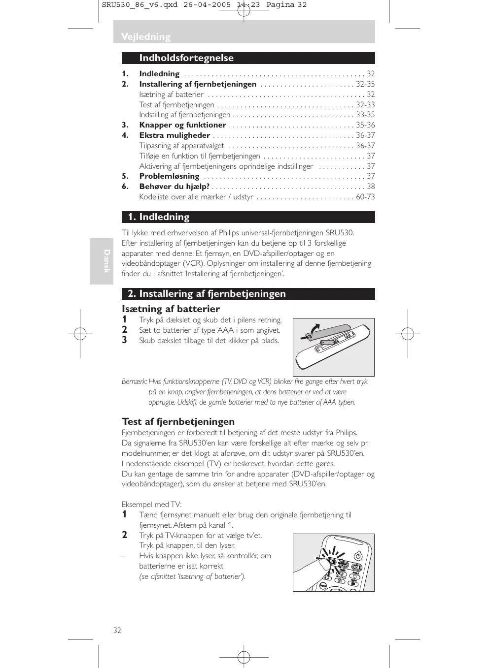 Isætning af batterier 1 Tryk på dækslet og skub det i pilens retning. 2 Sæt to batterier af type AAA i som angivet. 3 Skub dækslet tilbage til det klikker på plads. Bemærk: Hvis funktionsknapperne (TV, DVD og VCR) blinker fire gange efter hvert tryk på en knap, angiver fjernbetjeningen, at dens batterier er ved at være opbrugte. Udskift de gamle batterier med to nye batterier af AAA typen. Test af fjernbetjeningen Fjernbetjeningen er forberedt til betjening af det meste udstyr fra Philips. Da signalerne fra SRU530’en kan være forskellige alt efter mærke og selv pr. modelnummer, er det klogt at afprøve, om dit udstyr svarer på SRU530’en. I nedenstående eksempel (TV) er beskrevet, hvordan dette gøres. Du kan gentage de samme trin for andre apparater (DVD-afspiller/optager og videobåndoptager), som du ønsker at betjene med SRU530’en. Eksempel med TV: 1 Tænd fjernsynet manuelt eller brug den originale fjernbetjening til fjernsynet. Afstem på kanal 1. 2 Tryk på TV-knappen for at vælge tv’et. Tryk på knappen, til den lyser. Hvis knappen ikke lyser, så kontrollér, om batterierne er isat korrekt (se afsnittet ‘Isætning af batterier’).