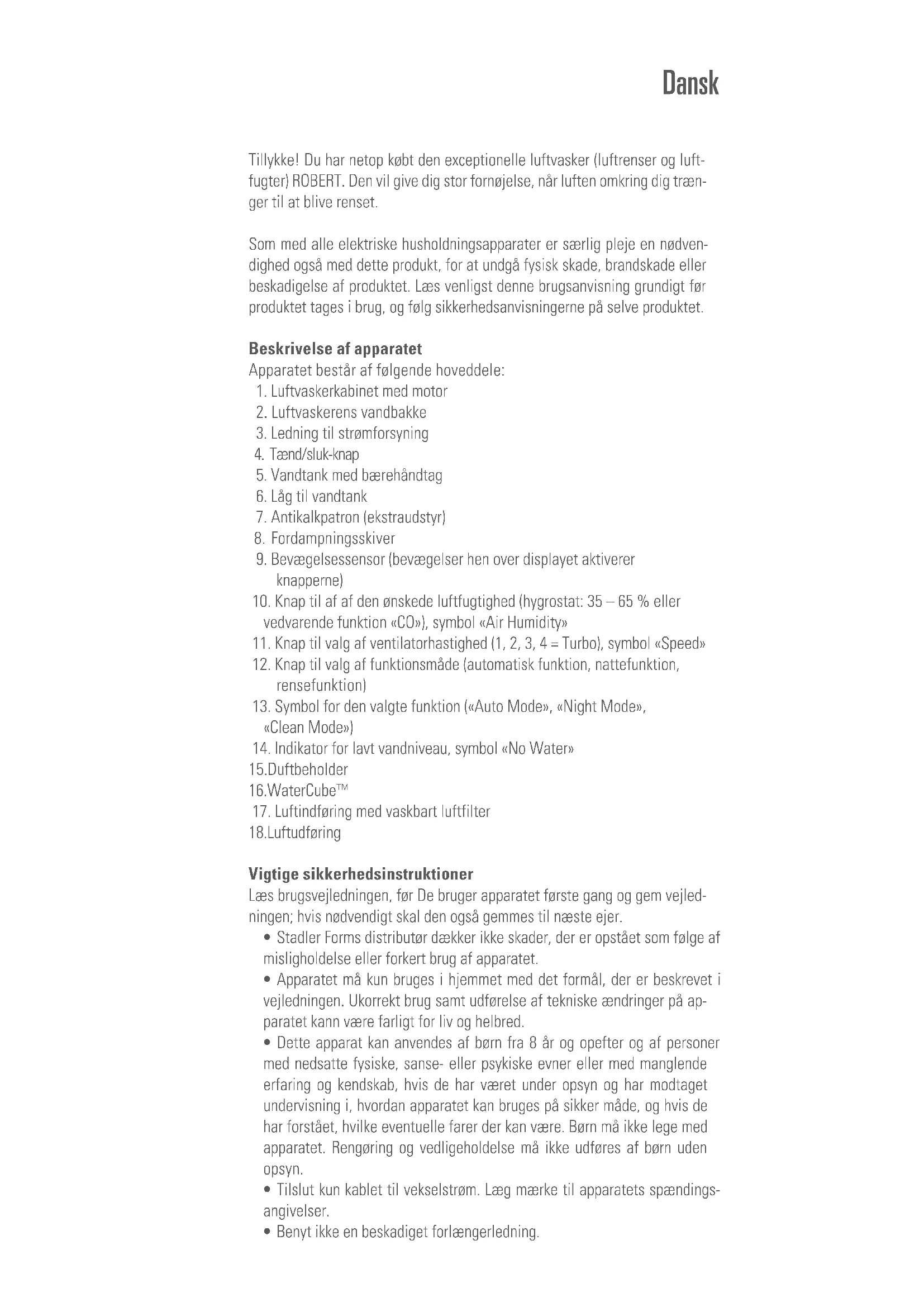 Vigtige sikkerhedsinstruktioner Læs brugsvejledningen, før De bruger apparatet første gang og gem vejled- ningen; hvis nødvendigt skal den også gemmes til næste ejer.