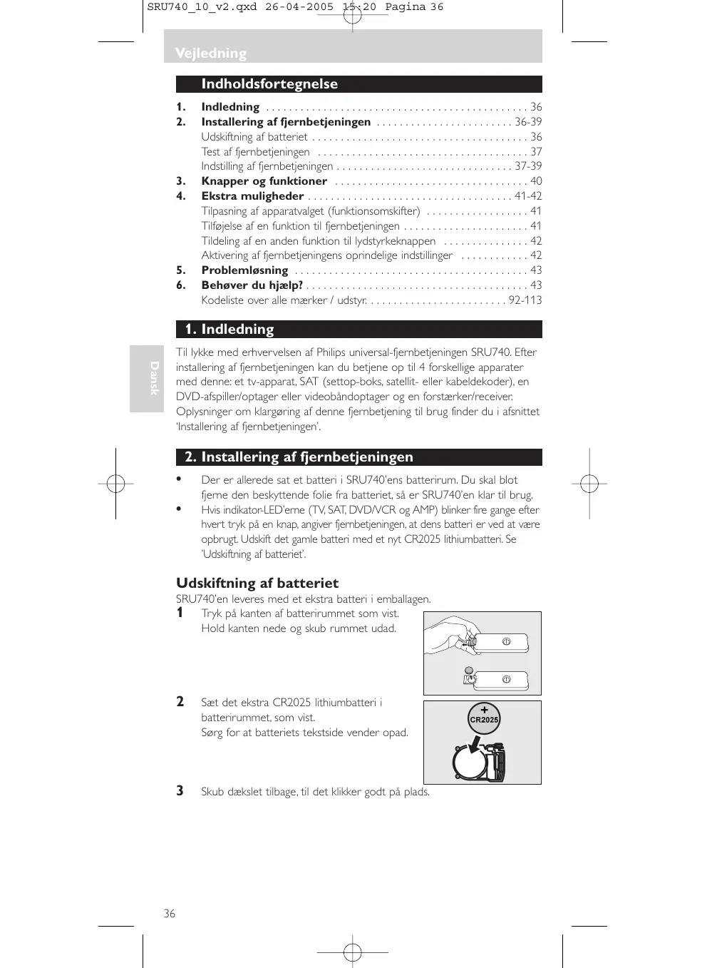 Hvis du har nogen spørgsmål om SRU740/10’en, så kan du altid kontakte os. Du kan finde vore kontaktoplysninger efter kodelisten bagest i denne vejledning. Inden du ringer, skal du læse denne vejledning omhyggeligt igennem. Du vil sikkert kunne løse de fleste problemer selv. Hvis du ikke finder svar på dine spørgsmål, så notér de oplysninger om dit udstyr, der står i kodelisten bagest i denne vejledning. Dette gør det lettere og hurtigere for vore servicefolk at hjælpe dig. Se efter modelnumrene i udstyrets brugsanvisning eller bag på dit udstyr. Når du ringer til vores hjælpelinie, skal du sørge for at have udstyret i nærheden, så vore servicefolk kan hjælpe dig med at afgøre, om fjernbetjeningen fungerer rigtigt. Modelnummeret på din Philips universal-fjernbetjening er SRU740/10 Købsdato: ......../......../........ (dag/måned/år)