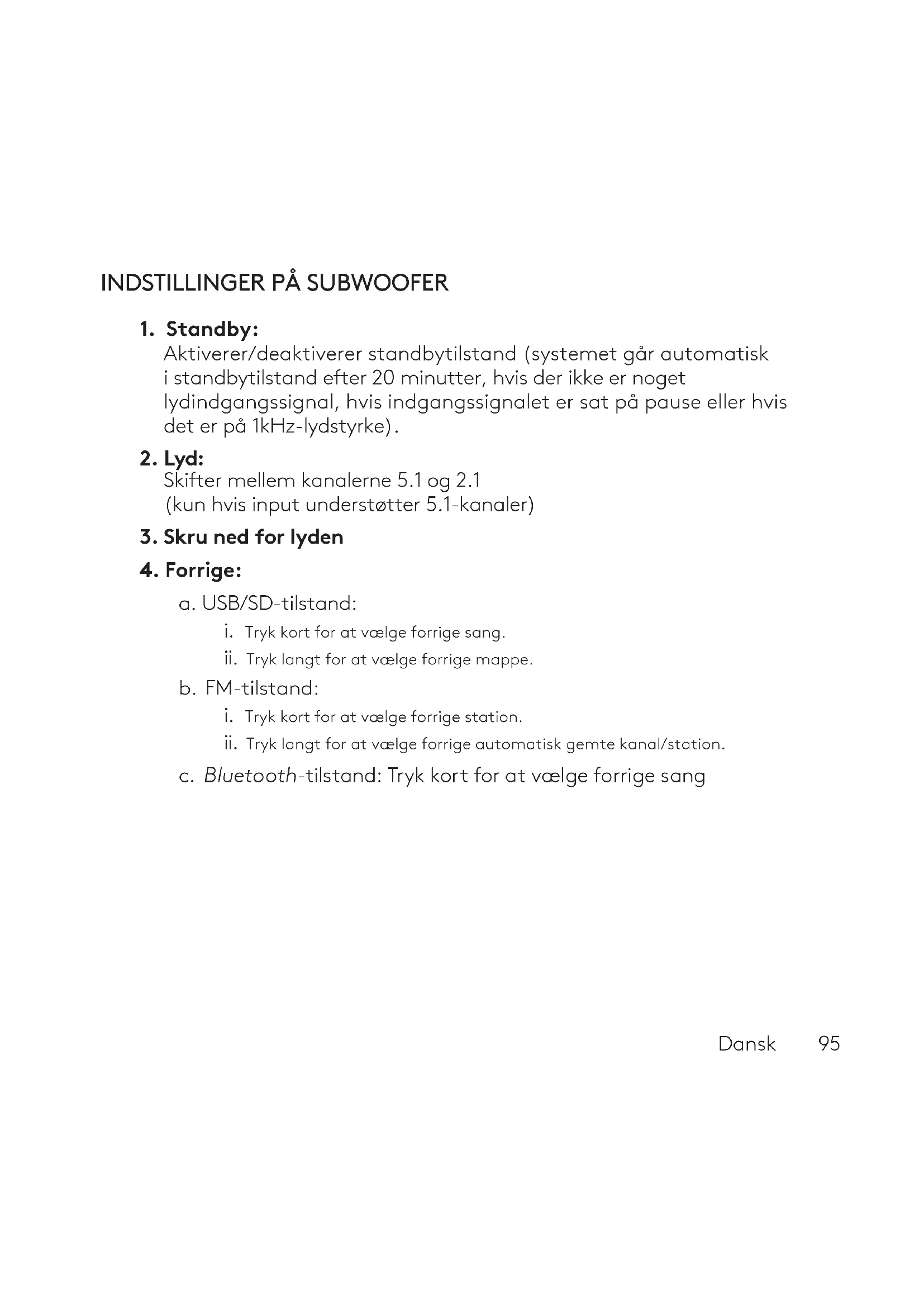 c. Bluetooth-tilstand: Tryk kort for at vælge forrige sang96 Dansk