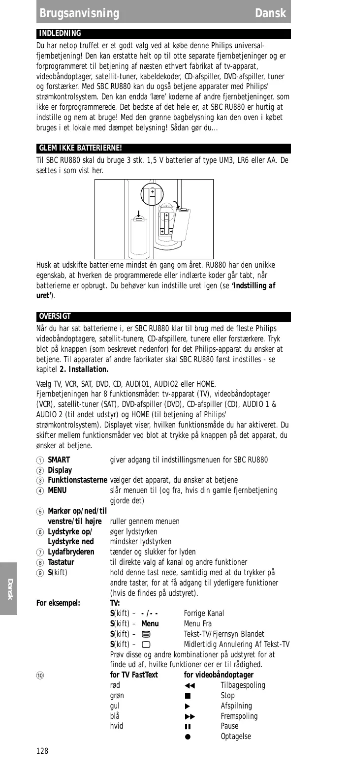 Husk at udskifte batterierne mindst én gang om året. RU880 har den unikke egenskab, at hverken de programmerede eller indlærte koder går tabt, når batterierne er opbrugt. Du behøver kun indstille uret igen (se ‘Indstilling af uret’). OVERSIGT Når du har sat batterierne i, er SBC RU880 klar til brug med de fleste Philips videobåndoptagere, satellit-tunere, CD-afspillere, tunere eller forstærkere. Tryk blot på knappen (som beskrevet nedenfor) for det Philips-apparat du ønsker at betjene. Til apparater af andre fabrikater skal SBC RU880 først indstilles - se kapitel 2. Installation. Vælg TV, VCR, SAT, DVD, CD, AUDIO1, AUDIO2 eller HOME. Fjernbetjeningen har 8 funktionsmåder: tv-apparat (TV), videobåndoptager (VCR), satellit-tuner (SAT), DVD-afspiller (DVD), CD-afspiller (CD), AUDIO 1 & AUDIO 2 (til andet udstyr) og HOME (til betjening af Philips' strømkontrolsystem). Displayet viser, hvilken funktionsmåde du har aktiveret. Du skifter mellem funktionsmåder ved blot at trykke på knappen på det apparat, du ønsker at betjene. SMART giver adgang til indstillingsmenuen for SBC RU880 Display Funktionstasterne vælger det apparat, du ønsker at betjene MENU slår menuen til (og fra, hvis din gamle fjernbetjening gjorde det) 5 Markør op/ned/til venstre/til højre ruller gennem menuen 6 Lydstyrke op/ øger lydstyrken Lydstyrke ned mindsker lydstyrken 7 Lydafbryderen tænder og slukker for lyden 8 Tastatur til direkte valg af kanal og andre funktioner 9 S(kift) hold denne tast nede, samtidig med at du trykker på andre taster, for at få adgang til yderligere funktioner (hvis de findes på udstyret). For eksempel: TV: S(kift) – - /- Forrige Kanal S(kift) – Menu Menu Fra S(kift) – a Tekst-TV/Fjernsyn Blandet S(kift) – I Midlertidig Annulering Af Tekst-TV Prøv disse og andre kombinationer på udstyret for at finde ud af, hvilke funktioner der er til rådighed. 0 for TV FastText for videobåndoptager rød G Tilbagespoling grøn L Stop gul B Afspilning blå F Fremspoling hvid K Pause M Optagelse 1 2 3 4
