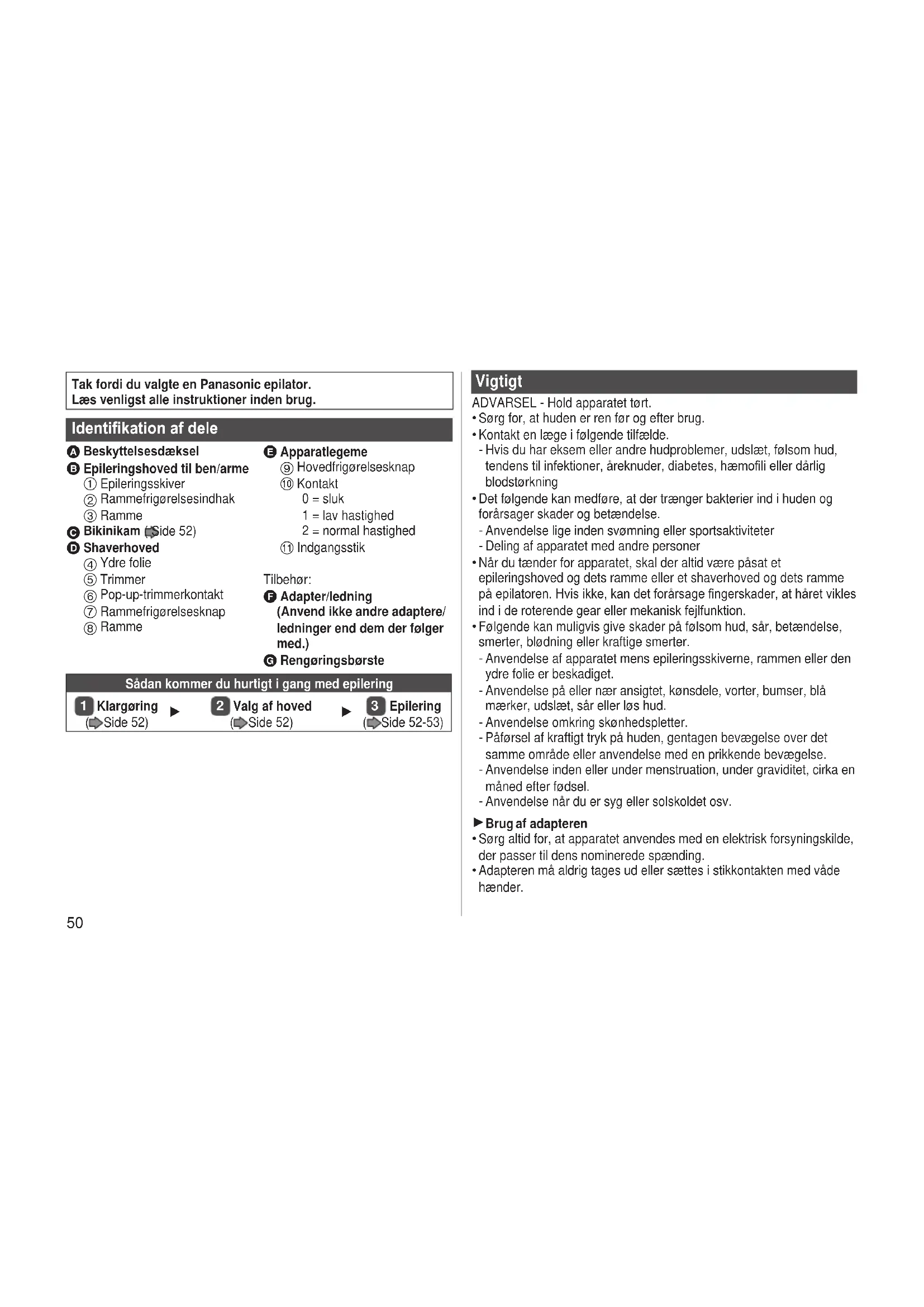 Side 52-53) Vigtigt ADVARSEL - Hold apparatet tørt. Sørg for, at huden er ren før og efter brug. Kontakt en læge i følgende tilfælde. Hvis du har eksem eller andre hudproblemer, udslæt, følsom hud, tendens til infektioner, åreknuder, diabetes, hæmoli eller dårlig blodstørkning Det følgende kan medføre, at der trænger bakterier ind i huden og forårsager skader og betændelse. Anvendelse lige inden svømning eller sportsaktiviteter Deling af apparatet med andre personer Når du tænder for apparatet, skal der altid være påsat et epileringshoved og dets ramme eller et shaverhoved og dets ramme på epilatoren. Hvis ikke, kan det forårsage ngerskader, at håret vikles ind i de roterende gear eller mekanisk fejlfunktion. Følgende kan muligvis give skader på følsom hud, sår, betændelse, smerter, blødning eller kraftige smerter. Anvendelse af apparatet mens epileringsskiverne, rammen eller den ydre folie er beskadiget. Anvendelse på eller nær ansigtet, kønsdele, vorter, bumser, blå mærker, udslæt, sår eller løs hud. Anvendelse omkring skønhedspletter. Påførsel af kraftigt tryk på huden, gentagen bevægelse over det samme område eller anvendelse med en prikkende bevægelse. Anvendelse inden eller under menstruation, under graviditet, cirka en måned efter fødsel. Anvendelse når du er syg eller solskoldet osv. Brug af adapteren Sørg altid for, at apparatet anvendes med en elektrisk forsyningskilde, der passer til dens nominerede spænding. Adapteren må aldrig tages ud eller sættes i stikkontakten med våde hænder.