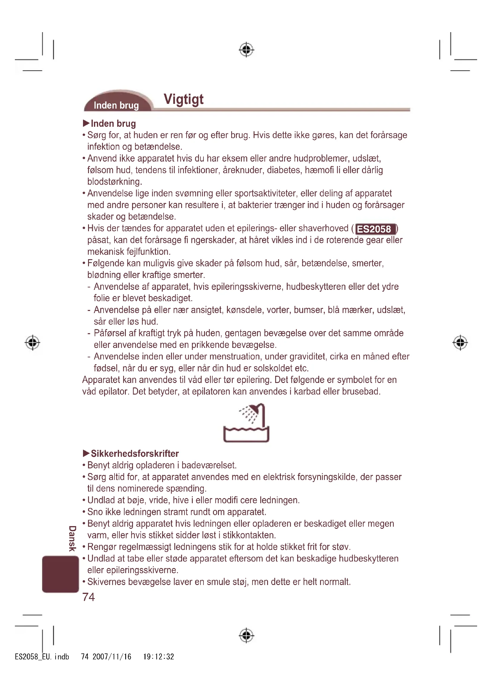 Frigöringsknapp för ramen Tillbehör: Laddare (RE7-44), rengöringsborste och väska (Använd inte andra tillbehör än de som levereras med apparaten.) ES2058_EU.indb 73 2007/11/16 19:12:3274 Dansk Vigtigt Inden brug Inden brug Sørg for, at huden er ren før og efter brug. Hvis dette ikke gøres, kan det forårsage infektion og betændelse. Anvend ikke apparatet hvis du har eksem eller andre hudproblemer, udslæt, følsom hud, tendens til infektioner, åreknuder, diabetes, hæmofi li eller dårlig blodstørkning. Anvendelse lige inden svømning eller sportsaktiviteter, eller deling af apparatet med andre personer kan resultere i, at bakterier trænger ind i huden og forårsager skader og betændelse. Hvis der tændes for apparatet uden et epilerings- eller shaverhoved ( ES2058